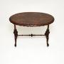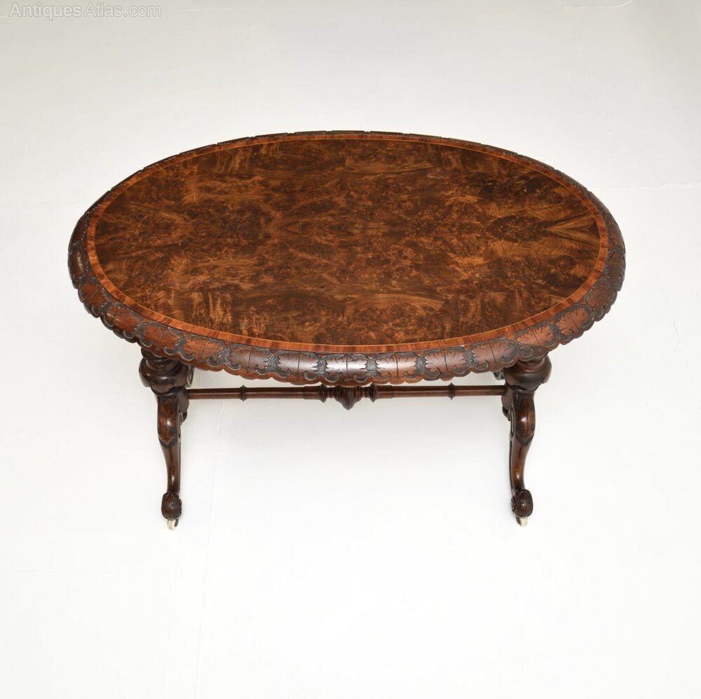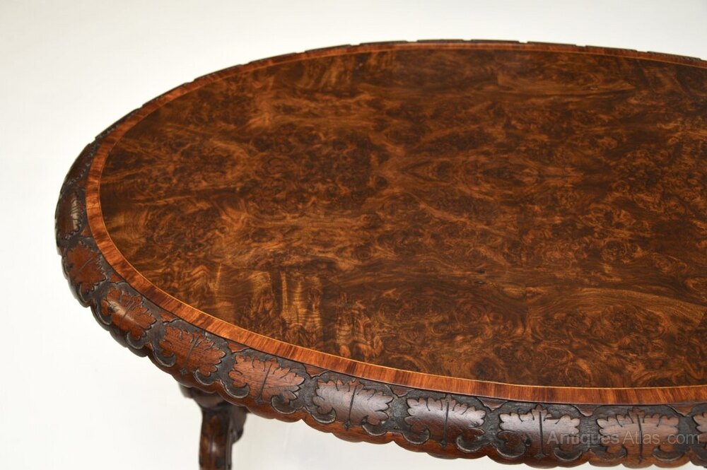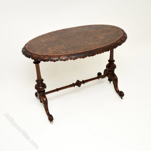 It is of extremely fine quality and is a lovely size. The oval top has gorgeous burr walnut grain patterns, it has a cross banded edge with fine and intricate carving around the outer edge. It stands on a stretchered base which also has exquisite carving, this is finished identically on all sides so it can be used as a free standing item, or against the wall on the side of a room.