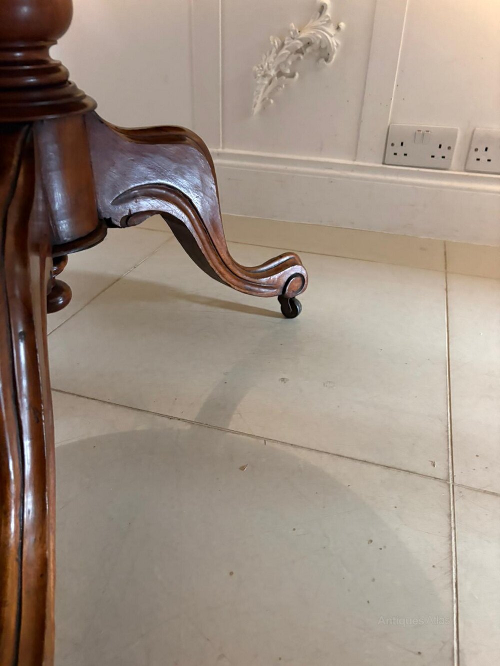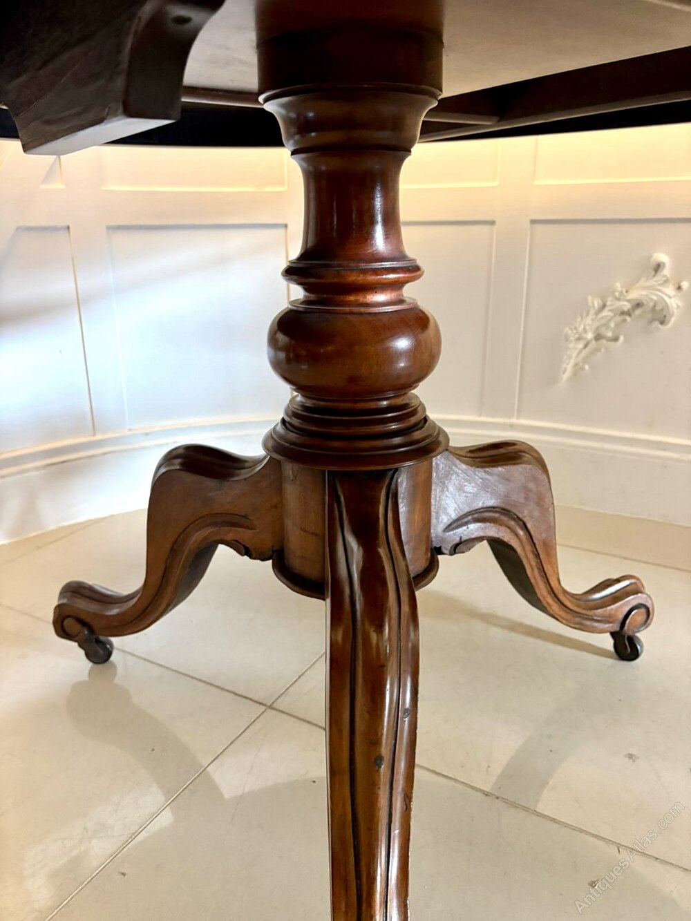 The table is raised on a well turned central pedestal column standing on four elegant swept sabre legs terminating in brass castors. The pedestal base is both strong and refined in design and allows the table to be easily moved when required.