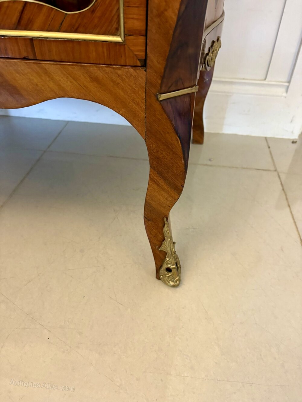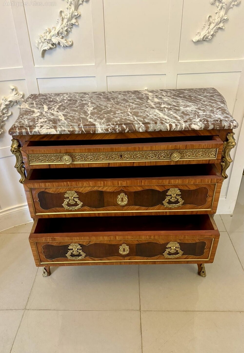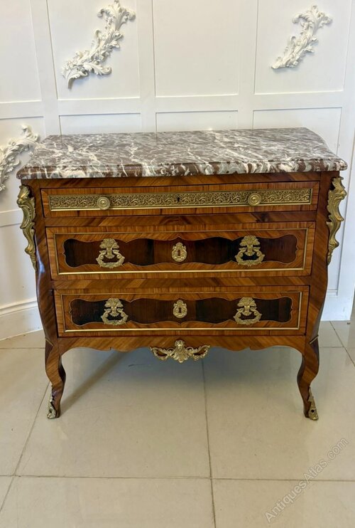 Outstanding quality antique Victorian French marble top commode chest of drawers having a pretty and shaped marble top with a moulded edge above 3 outstanding quality kingwood and ormolu mounted drawers with original ornate ormolu handles, shaped sides standing on shape cabriole legs with ormolu mounted feet.