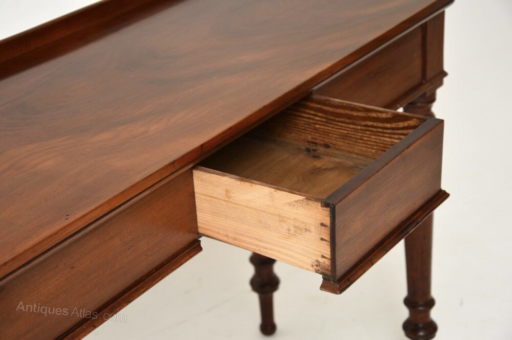 It is of fantastic quality, crafted from absolutely gorgeous solid mahogany. It is an impressive size, it is quite rare to find an early model like this in this size. The legs are beautifully turned, there is a useful single drawer in the centre with fine, hand cut dovetailed joints.