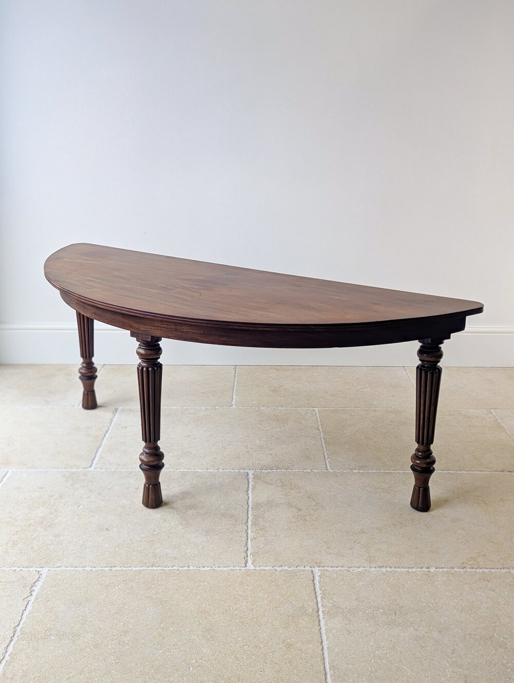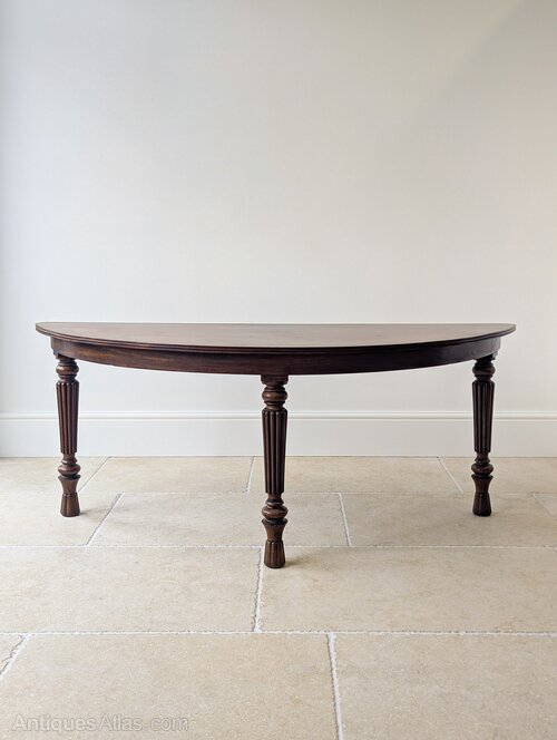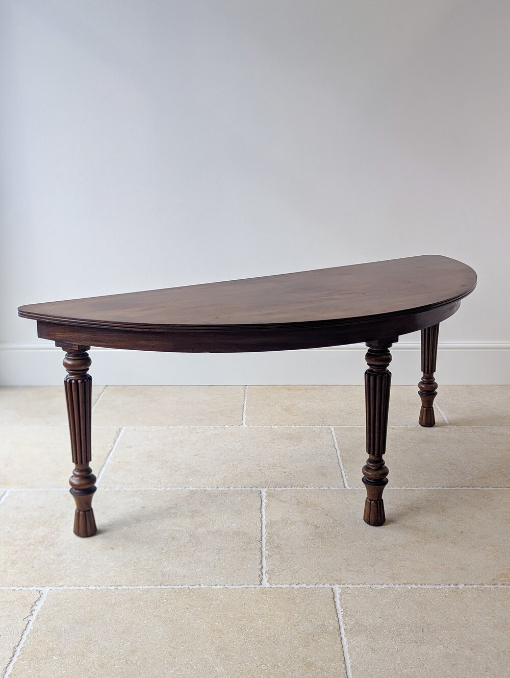 A substantial Victorian mahogany console table, with a long, solid D-end top featuring a continuous reeded edge, set over a deep frieze and raised on three beautiful turned and fluted legs terminating in striking lobed feet.