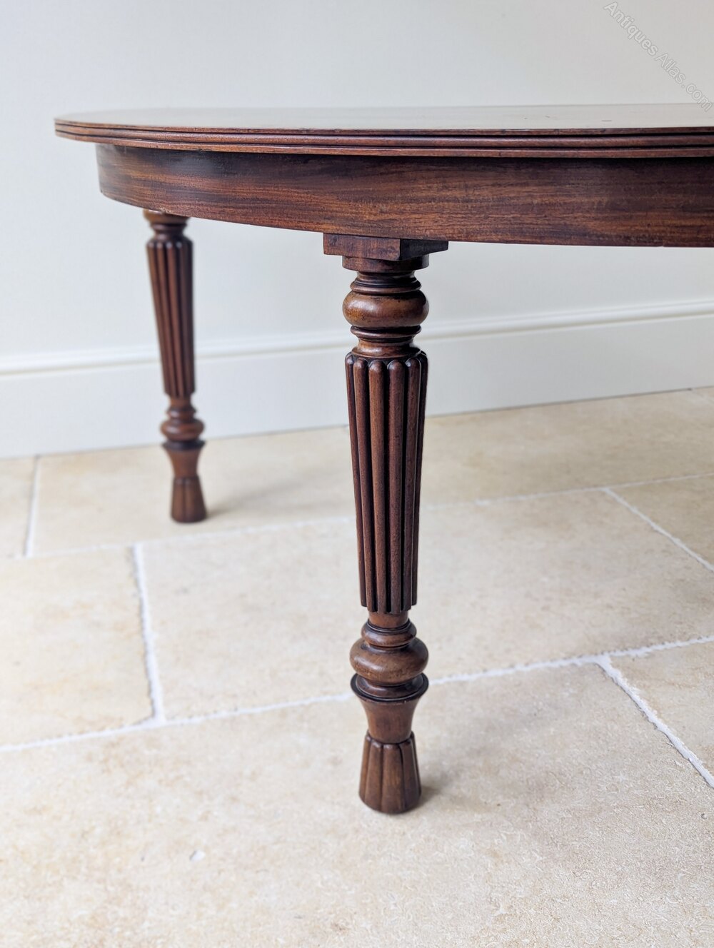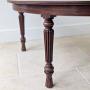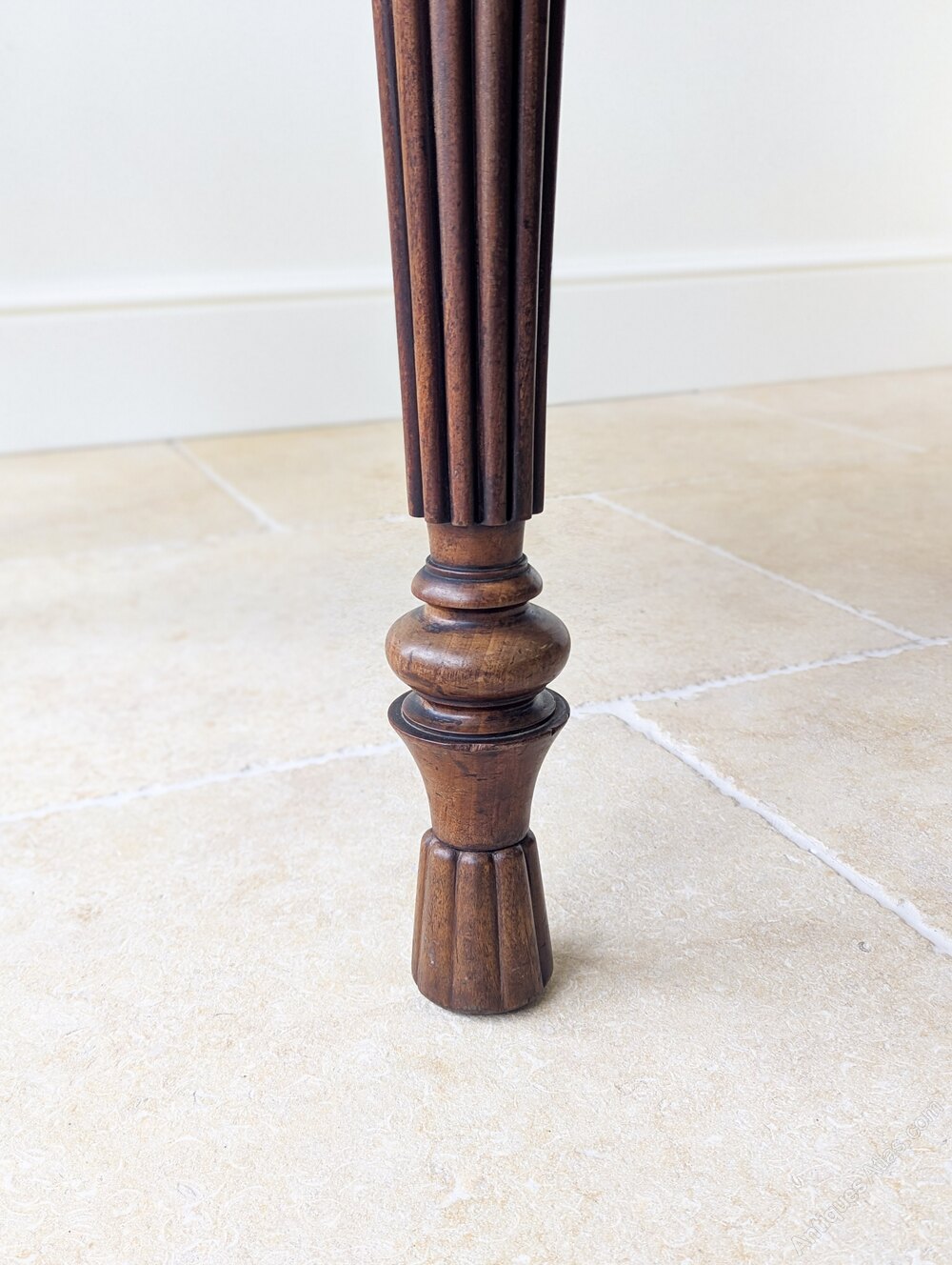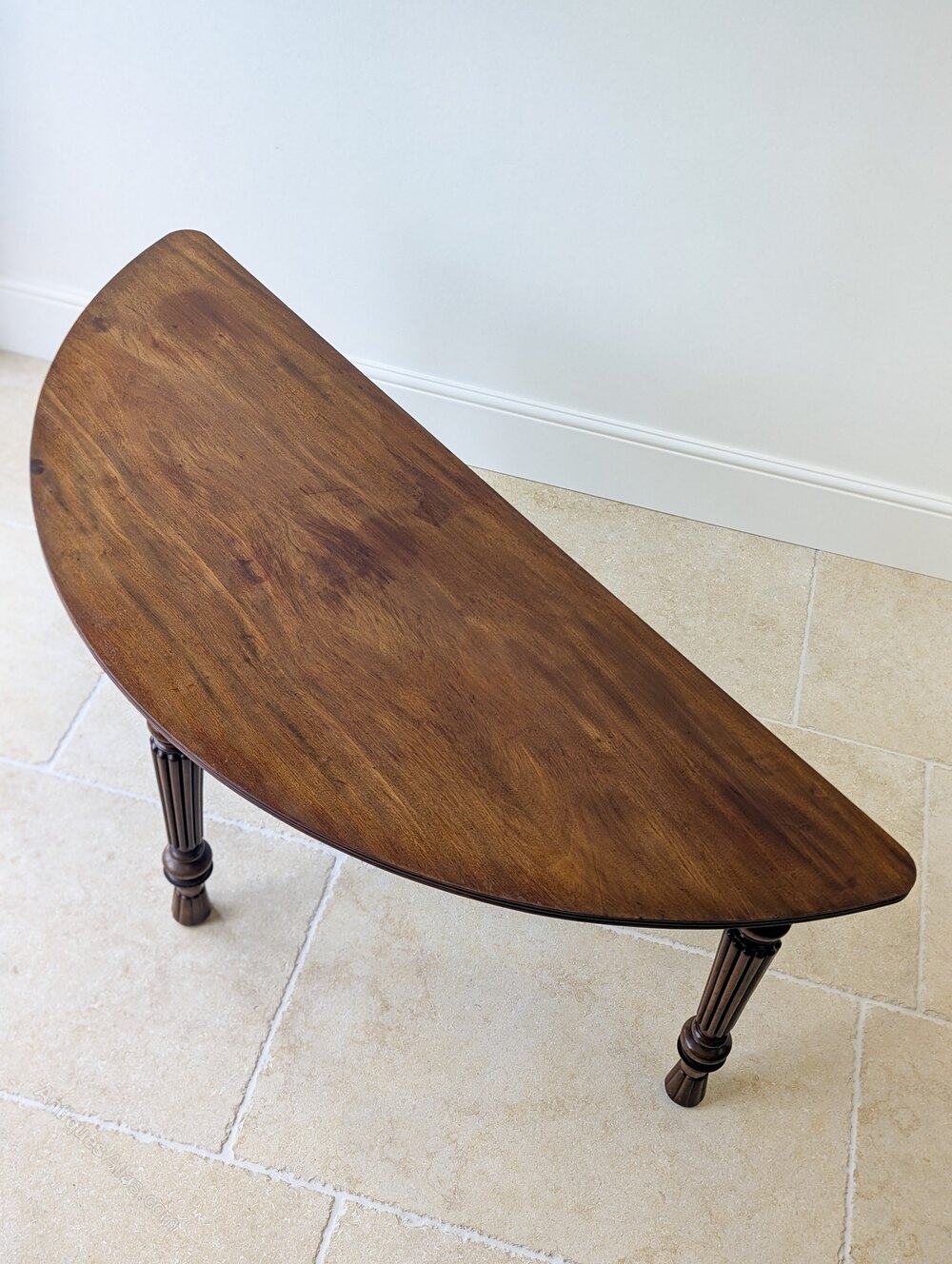 A substantial Victorian mahogany console table, with a long, solid D-end top featuring a continuous reeded edge, set over a deep frieze and raised on three beautiful turned and fluted legs terminating in striking lobed feet.