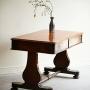 Antique Victorian Mahogany Library Table. The rectangular top sits above two frieze drawers. The table is supported by shaped trestle ends joined by a central turned stretcher, terminating in bun feet. A well-proportioned and versatile piece, suitable for use as a writing desk, library table, or occasional table in a study or living room