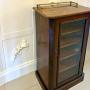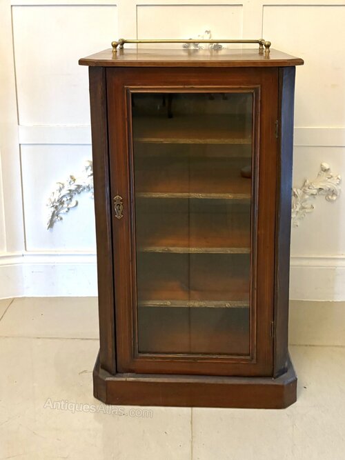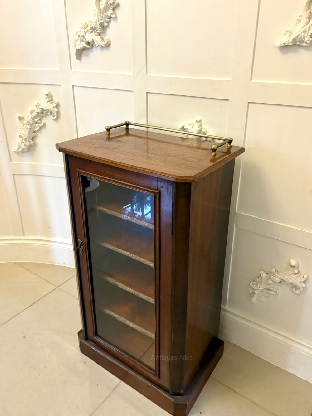 The cabinet displays the refined craftsmanship typical of the period with a moulded top edged by a brass gallery rail, a bevelled glazed panel door, and a shaped plinth base. The warm mahogany patina and subtle grain pattern highlight the cabinet’s age and character.