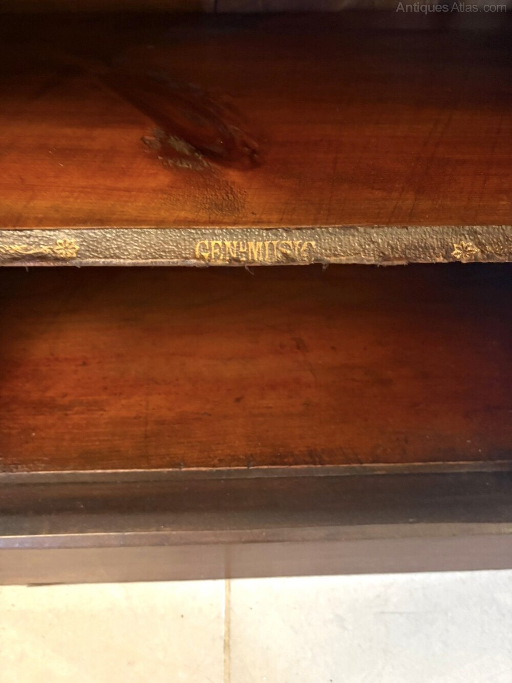 Material: Mahogany with gilt-tooled leather shelf edges and brass fittings