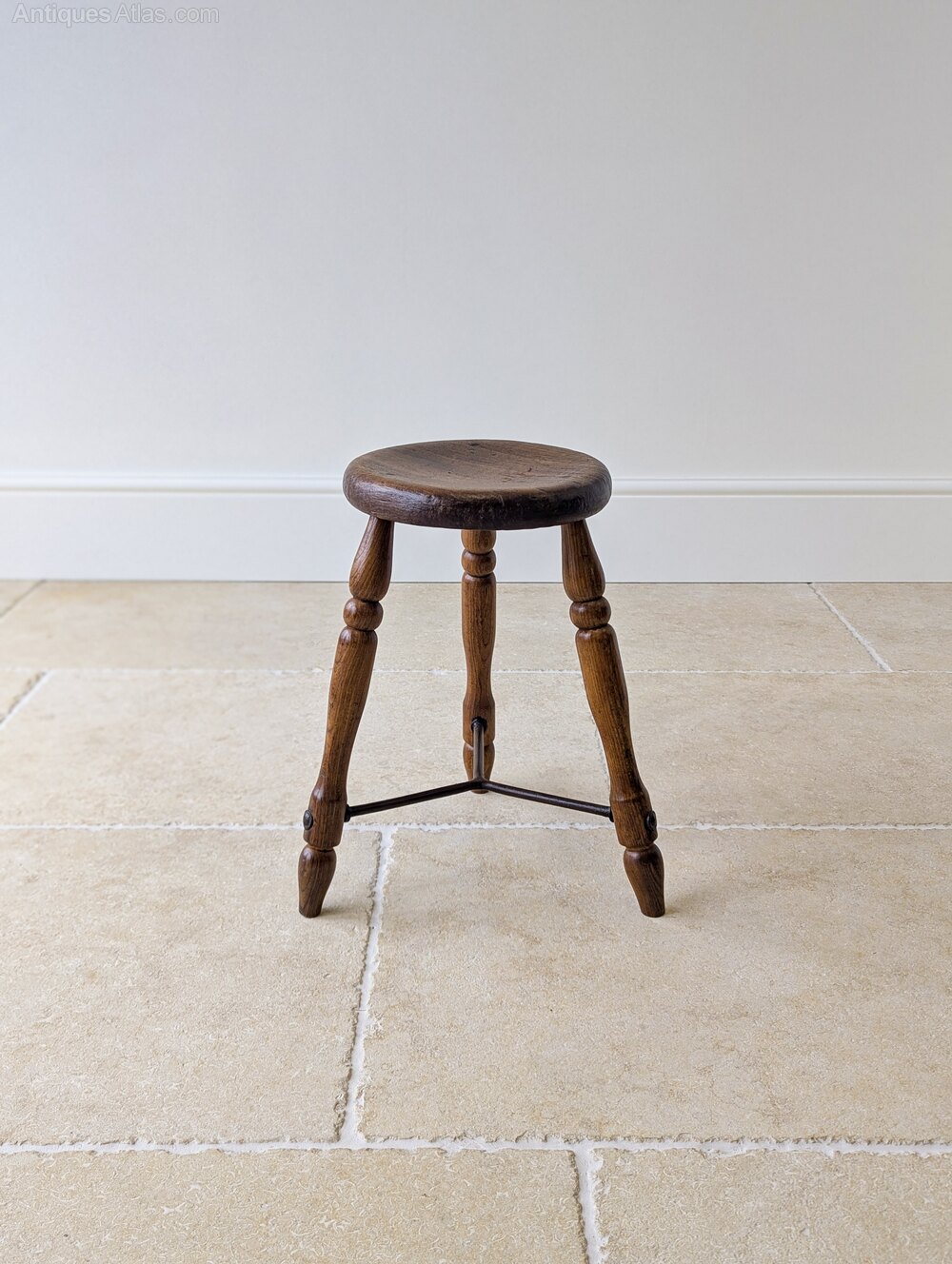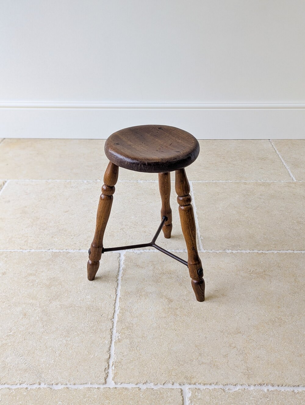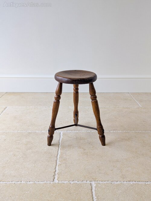 A characterful Victorian oak country stool, the thick round seat with softly worn edge is set over three well-turned legs united by an iron stretcher.