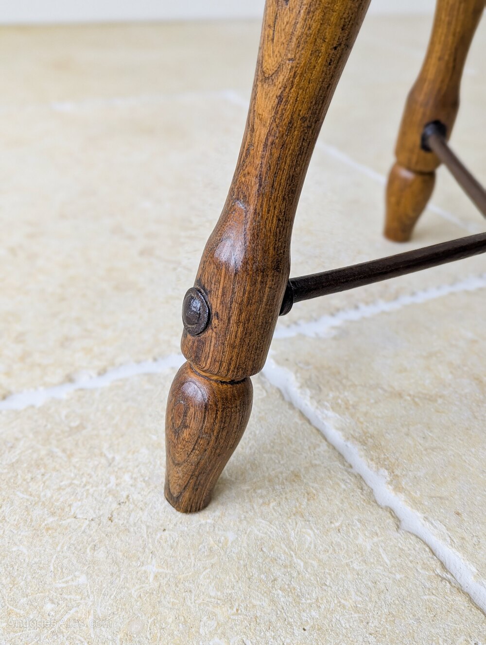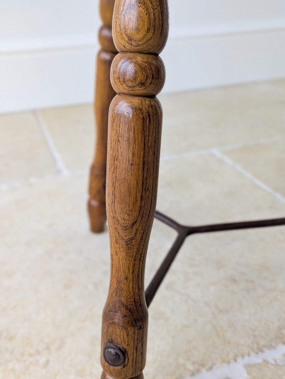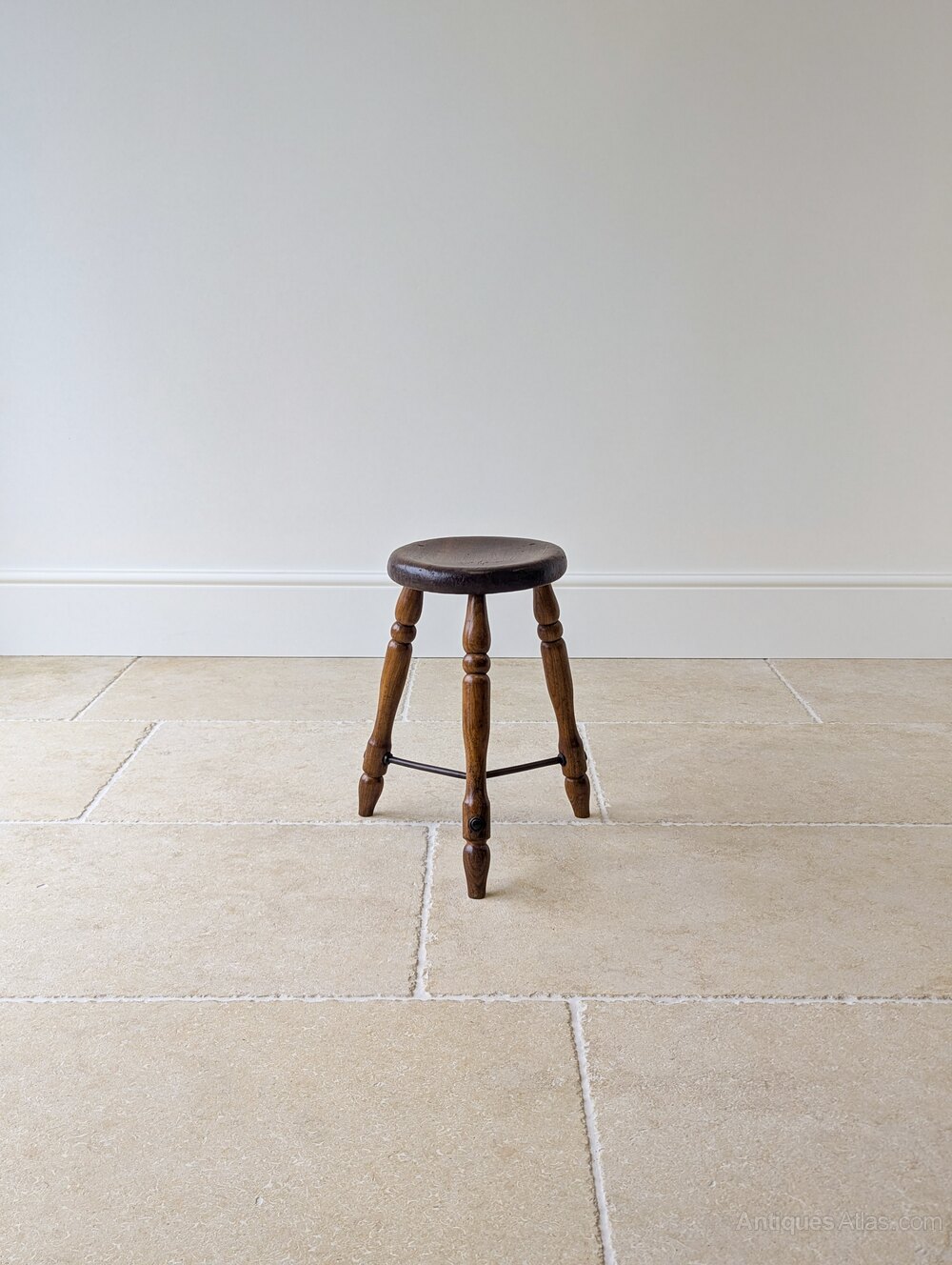 A characterful Victorian oak country stool, the thick round seat with softly worn edge is set over three well-turned legs united by an iron stretcher.