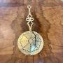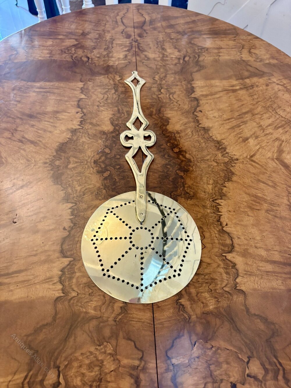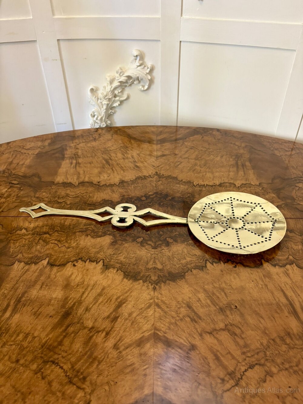 Antique Victorian quality brass skimmer having a shaped handle attached to a round brass skinner with spider web decoration.