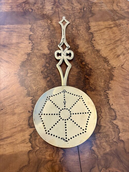 A lovely decorative piece. Antique brass skimmers were primarily used for skimming the surface of liquids, especially in cooking and food preparation. They were designed to remove impurities, foam, or excess fat from broths, soups, and other cooking liquids, and were also used to retrieve items like meat or herbs from stews. Additionally, they were employed in dairies to skim cream from milk.