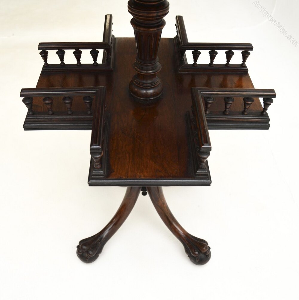 It is of extremely fine quality, the table top has stunning rosewood grain patterns, it stands on a beautifully turned and fluted central column base. In the centre there is a four section revolving bookshelf with pierced gallery edges. The base is beautifully carved, with four splayed legs that terminate in claw and ball feet, and brass casters beneath.