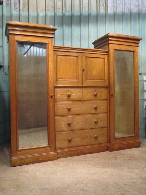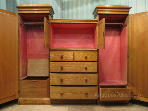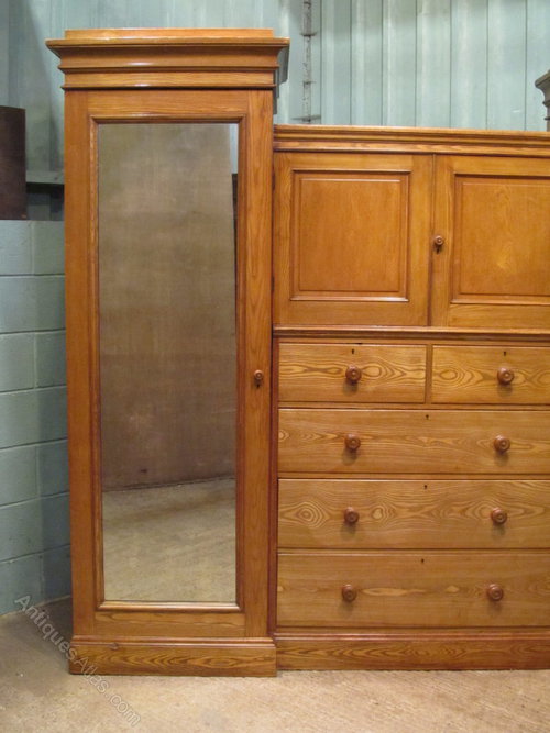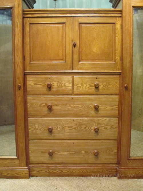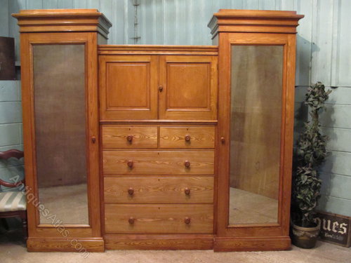 Antique Victorian Quality Ash Sentry Box Wardrobe Compactum and dating form around 1880. To each end there is a stepped cornice top above a full length mirrored door with turned knob handles and with internal hanging rails and original satin fabric lining. To the base to one side there is a deep lidded compartment and to the other side there is a deep drawer both of which have original satin lining. To the centre there is a cornice top above two fielded panelled doors again with the interior being satin lined and above two short drawers over three long graduating drawers all of which are ash lined with original turned knob handles. It stands on a deep plinth base and separates for ease of transporting.