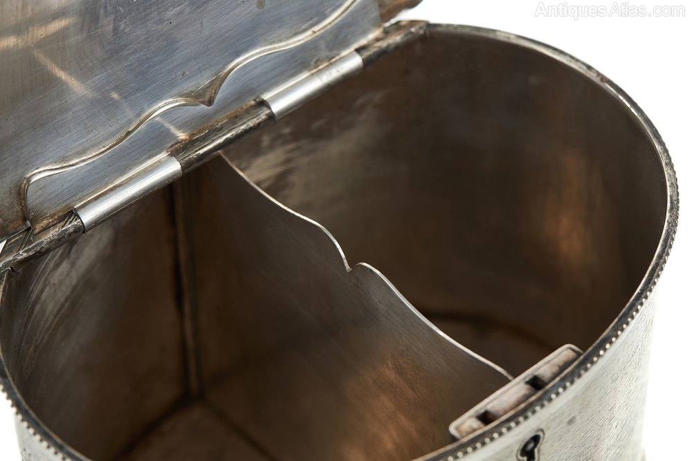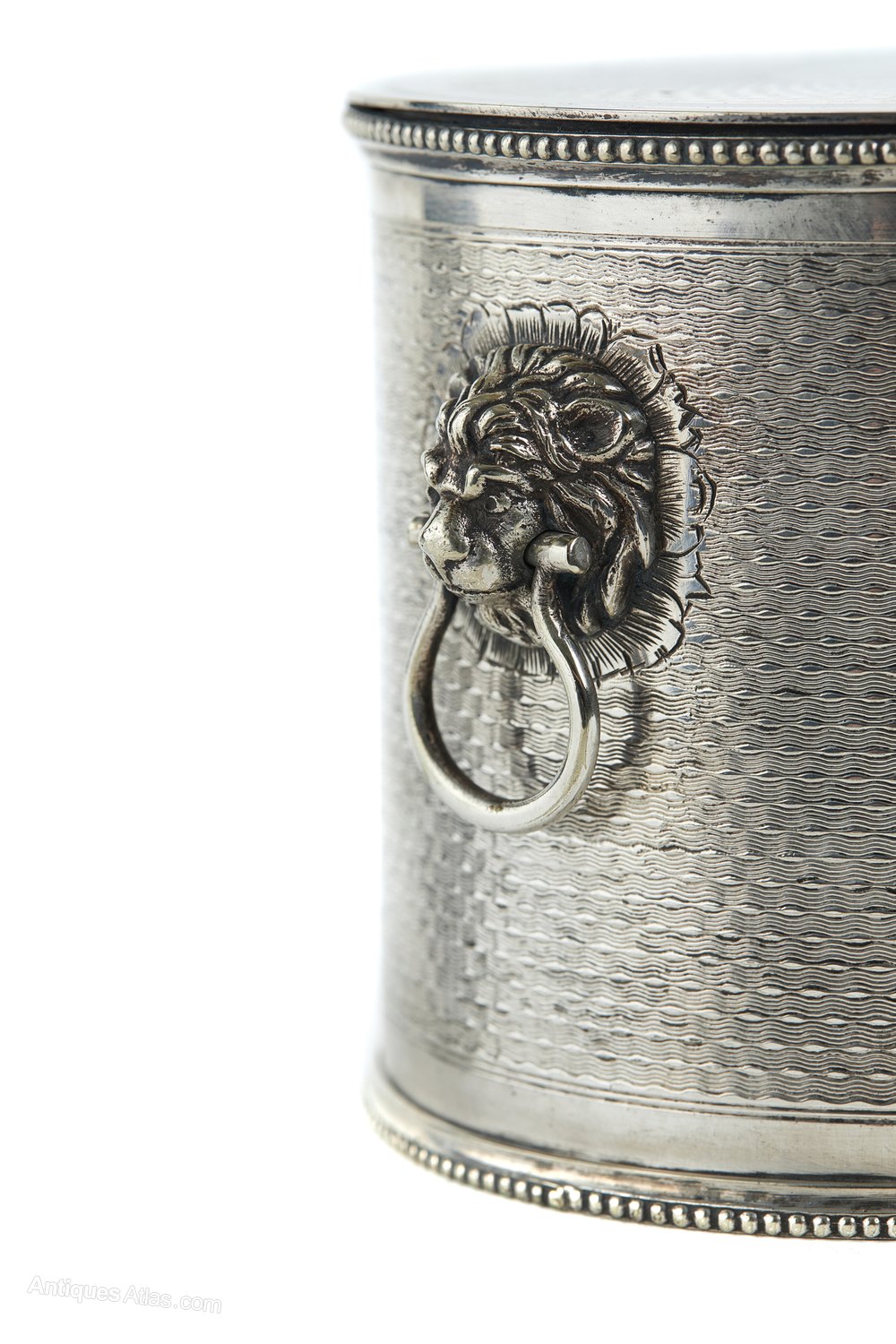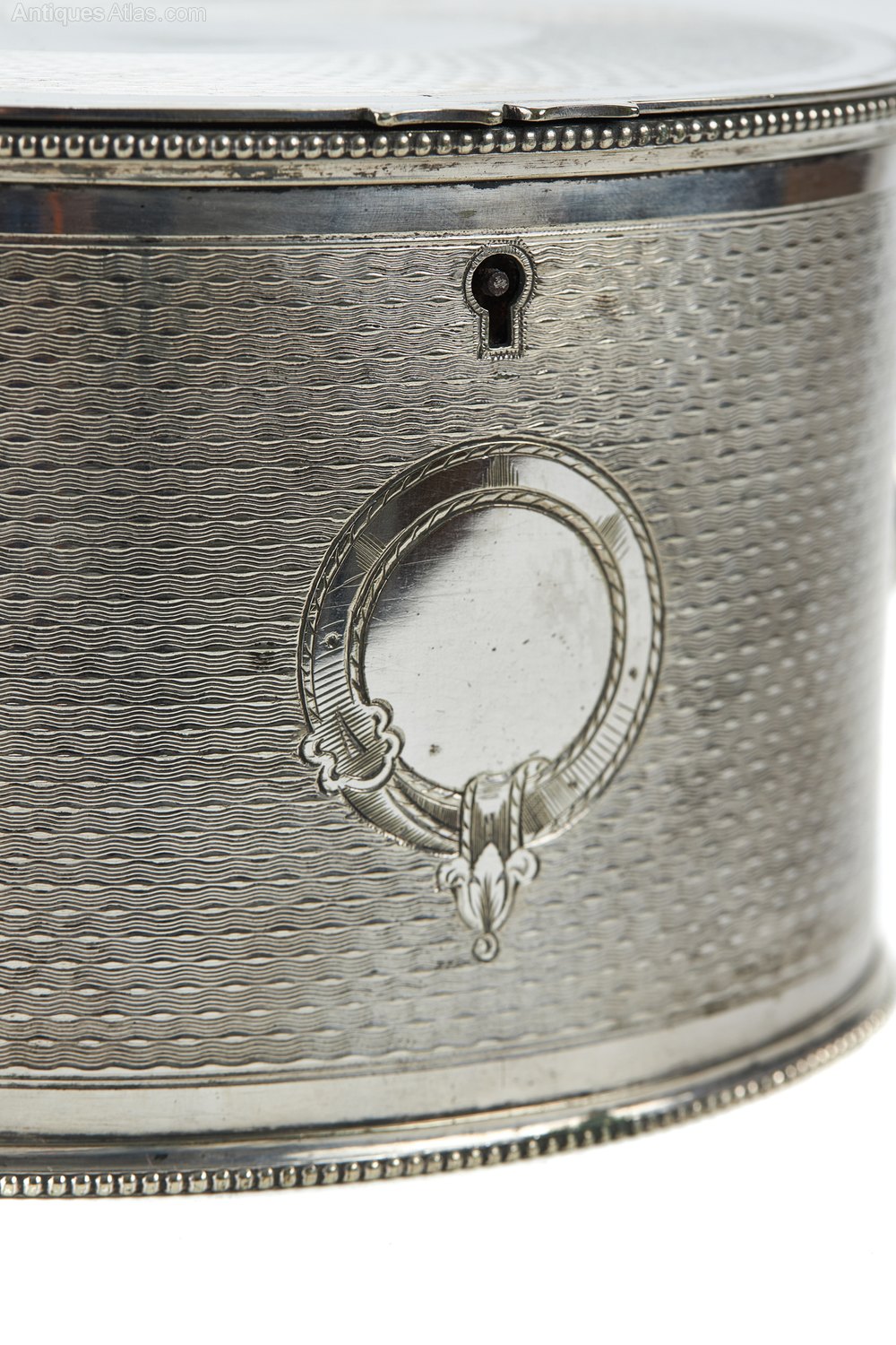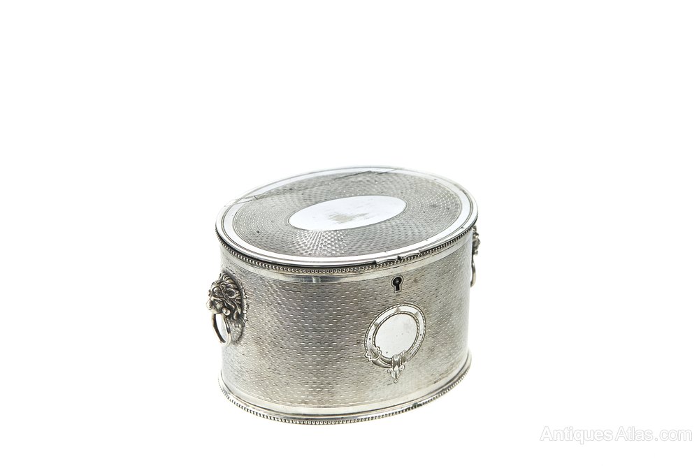 Antique Victorian Silver Plated Tea Caddy having oval form with engine turned decoration, twin lion mask handles to each side with a hinged cover, the foot and top rims with beaded design.