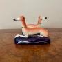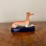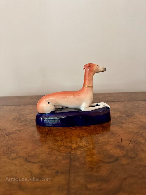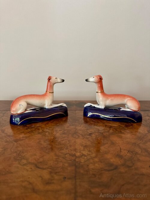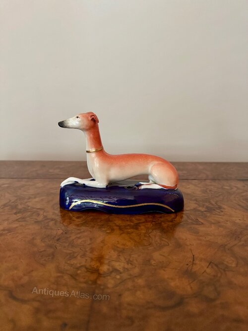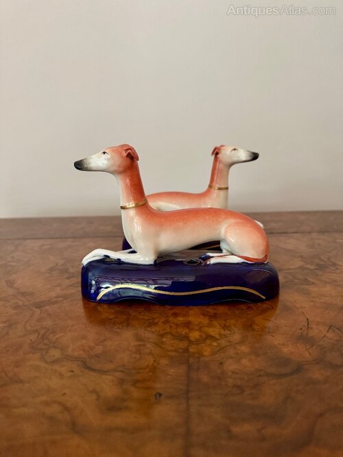 Lovely quality pair of antique Victorian Staffordshire greyhound inkwells, having a pair of greyhounds laying down with matching collars and a hole to the front for a pen, on a blue gilded shaped base hand painted in wonderful in brown, orange, blue and gold colours.