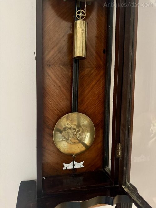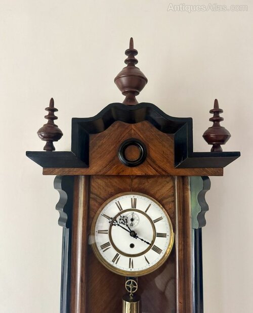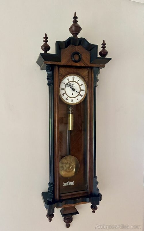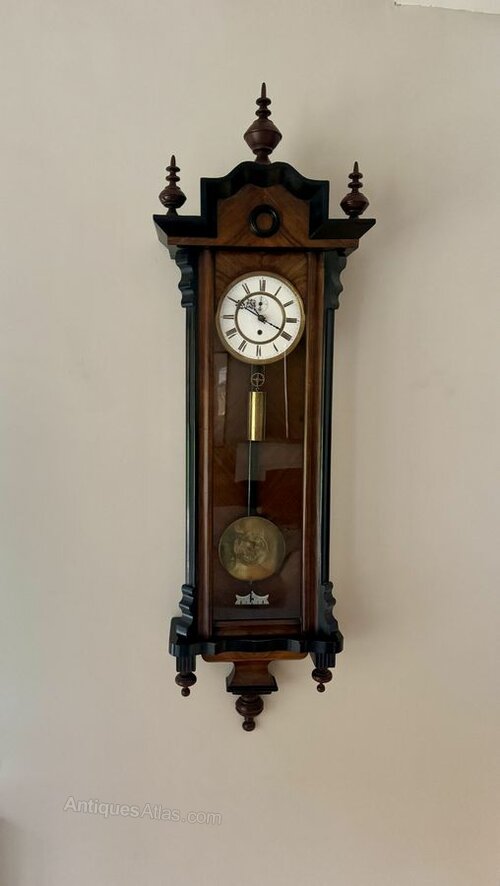 Stunning quality antique Victorian walnut & ebonised wall clock, having a quality antique 19th century wall clock with a stunning walnut case with an ebonised finish, with a shaped top and three carved finales above a single glazed door flanked by carved ebonised columns casing a white dial with black Roman numerals and ornate black hands cased within a brass bezel above a single weight and a circular brass pendulum, having a quality eight day movement with a winding key, terminating into a shaped base finished with carved finales.