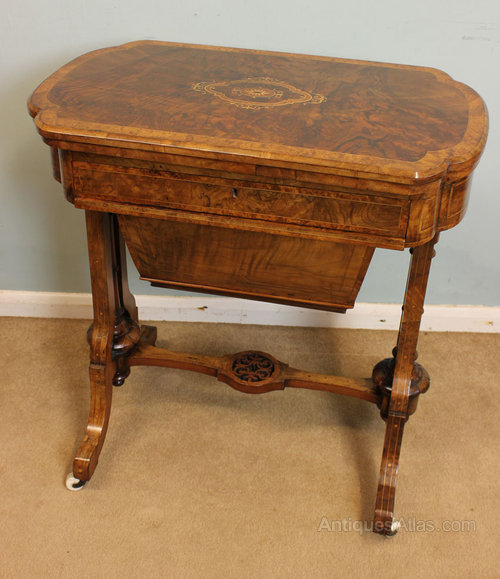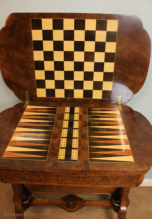 Antique Victorian Games Table. This antique 19th century Victorian burr walnut sewing table / games table has a lovely inlaid shaped top this opens to reveal backgammon board with cribbage board to the centre with chess board / draughts board having drawer and sewing box under all supported by inlaid and shaped legs united by inlaid stretcher. Circa 1875