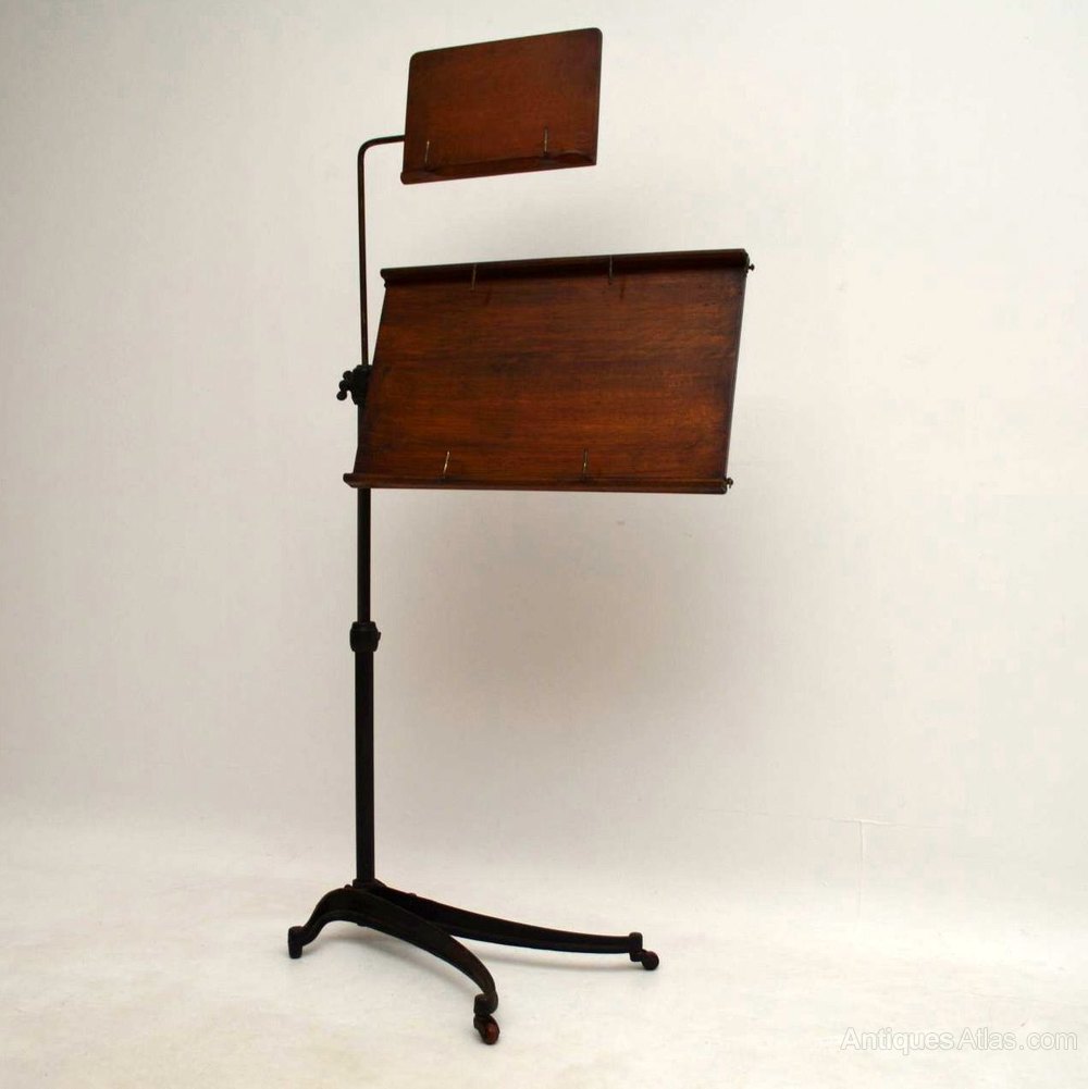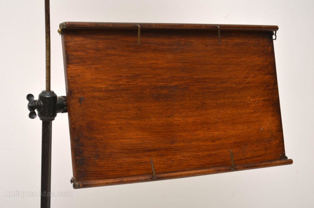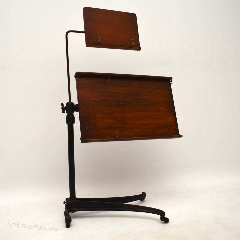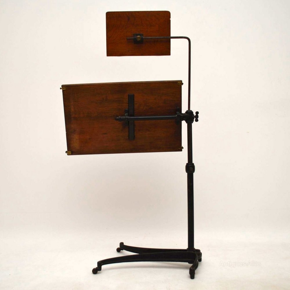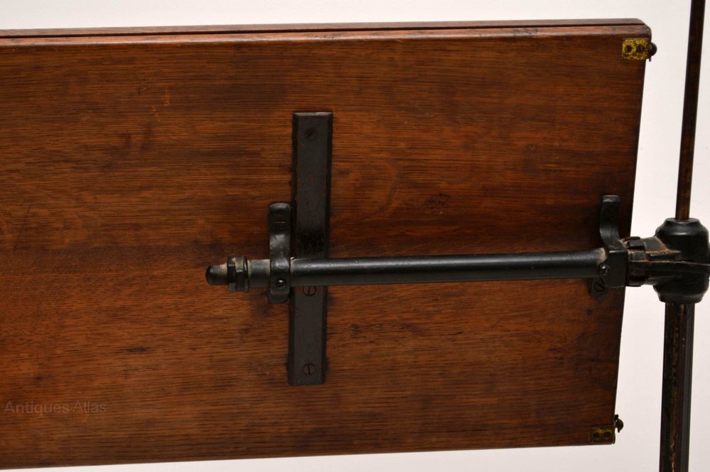 This is the Rolls Royce of antique reading antique tables & it’s in excellent original condition. It’s also rare to find one with two adjustable antique tables. Take a good look at all the images, especially the ones of the underneath mechanisms. The frame is wrought iron & you can see the makers patent marks in the images. The two separate solid oak table tops are both adjustable & tilt with ledges to stop items falling off. The shaped base has a generous spread & sits on the original casters. I would say it’s Victorian, but some expert could probably date it exactly by the letters & numbers on the rough iron.