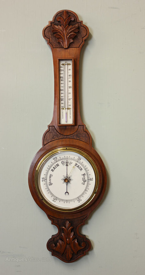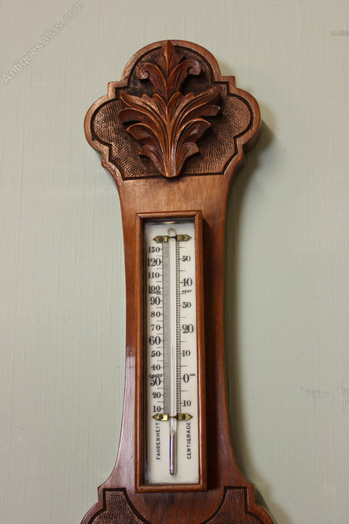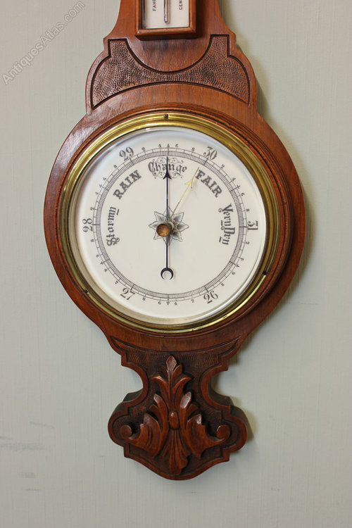 Antique Aneroid Barometer, This Edwardian walnut case banjo shaped aneroid barometer has lovely carved detail , Circa 1910