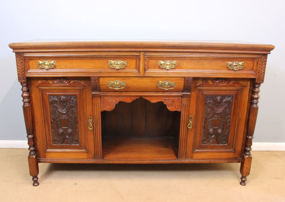 Antique Walnut Chiffonier Sideboard Base. This antique walnut sideboard / chiffonier base has two long drawers with short drawer under and display hutch below all the drawers fitted with decorative brass handles. Flanked either side by cupboard the cupboard door fronts having a lovely carved panel with carved detail above either side having turned and reeded supports and turned feet. The interior has a single shelf to the left hand cupboard the right hand side cupboard has single shelf and cellarette drawer below. Please see photo the top has shrinkage to the right hand side back.