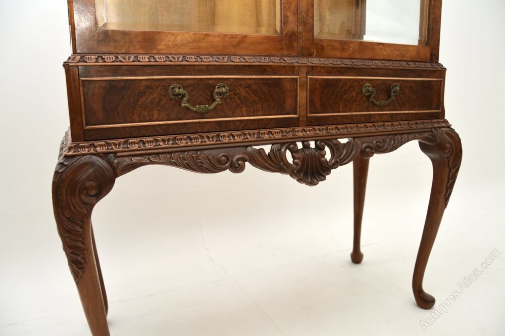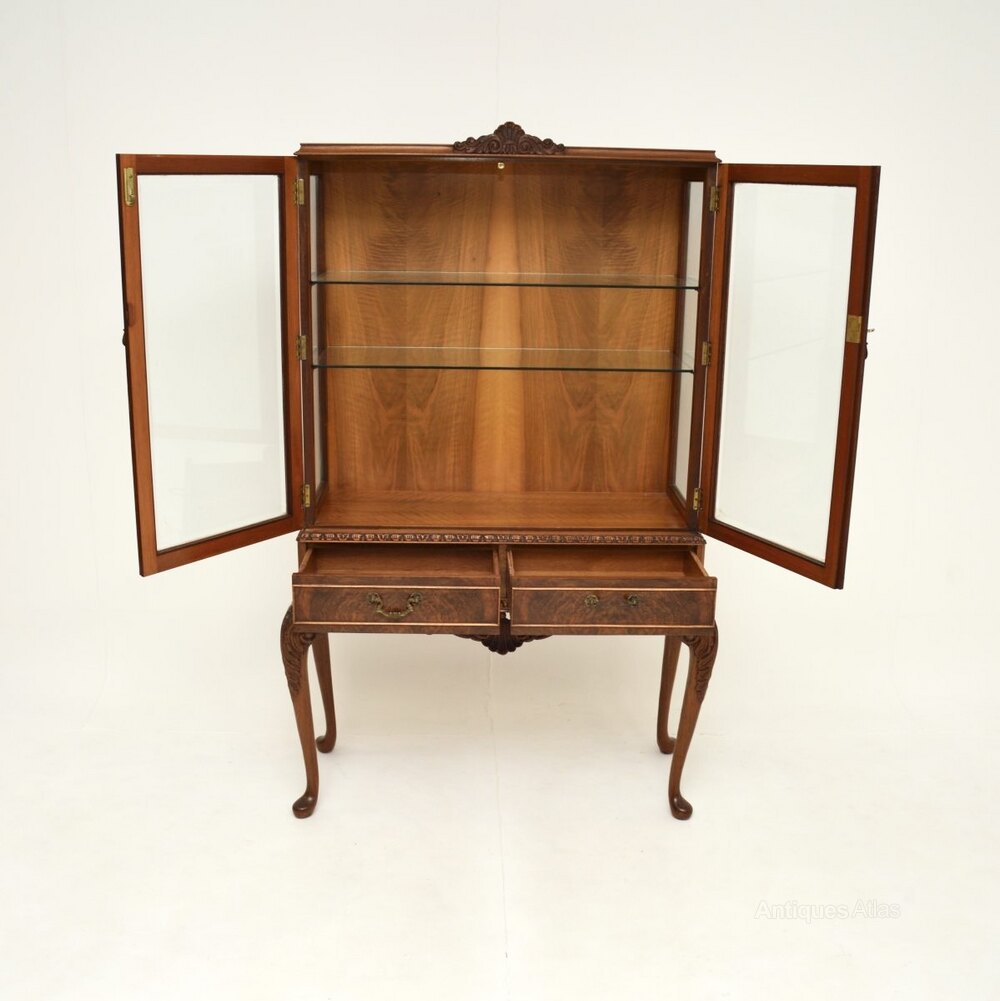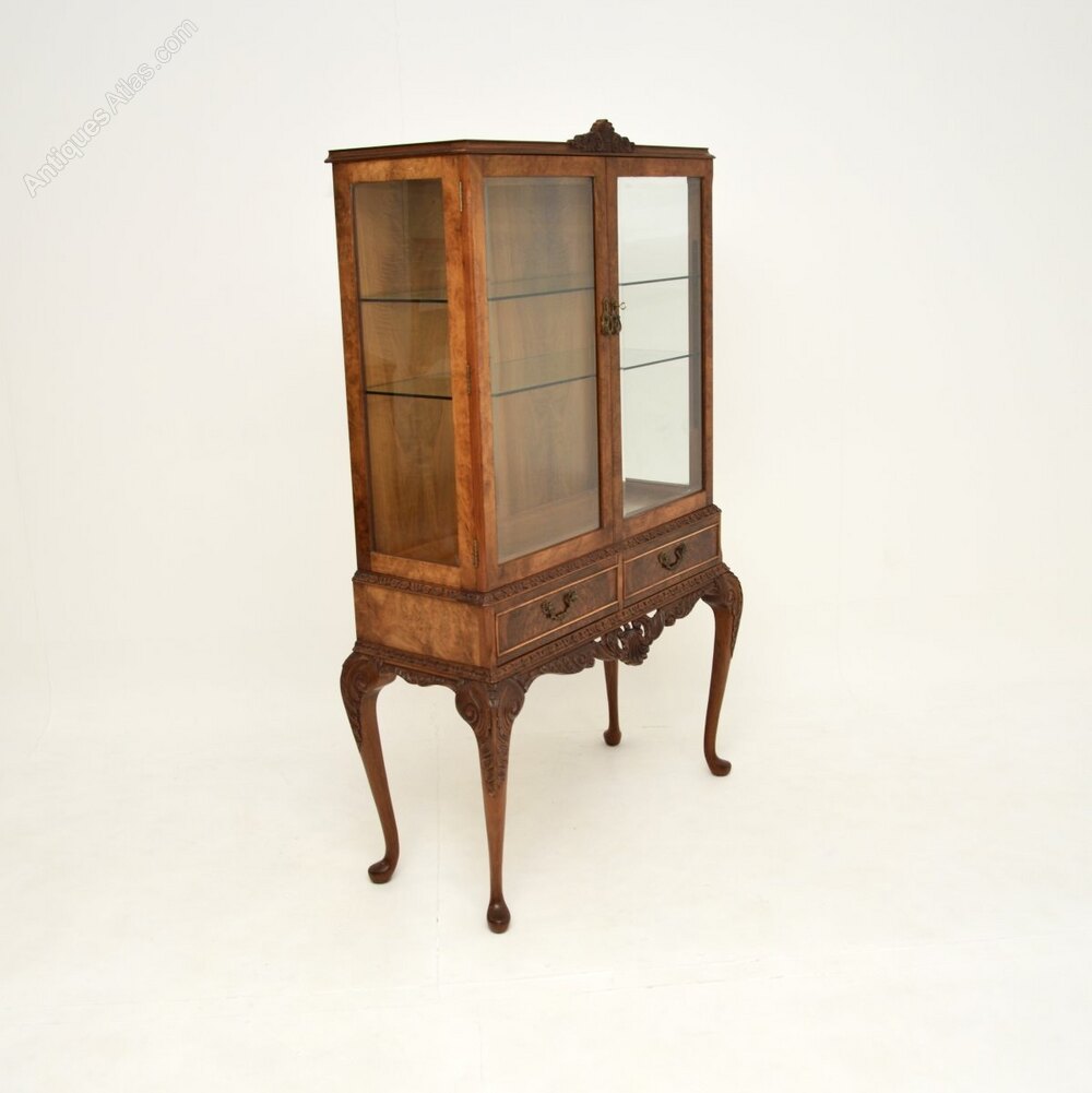 A superb antique burr walnut Queen Anne style display cabinet. This was made in England, it dates from around the 1930’s period.