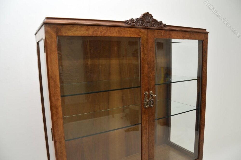 The quality is excellent, this has bevelled glass doors, there is stunning and intricate carving around the lower and top edges. The burr walnut grain patterns are fantastic, and this has a polished walnut interior as well, with two adjustable glass shelves.