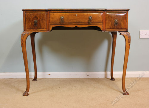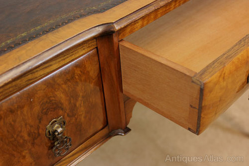 Antique Walnut Writing Table, Antique 20th Century shaped figured walnut writing table having a tooled leather writing surface. The walnut desk has three walnut drawers with brass drop handles, Each draw has hand cut dovetails all made from mahogany, The desk is supported by cabriole legs with pad feet and has carved detail to the top of the leg. The desk is polished and finished all round so can be used in the centre of a room. Circa 1910