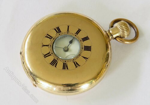 The watch measures 42mm diameter excluding the winding stem and the loop so it is smaller than a standard 50mm pocket watch . The case is 10ct gold filled and was made by the English watch case maker, Aaron Dennison, supplier of cases to Waltham UK. The front cover has a small central lens surrounded by enamel filled roman numerals. The case is in good condition, just a couple of small indentations to the back, and some rubbing to the sides.