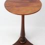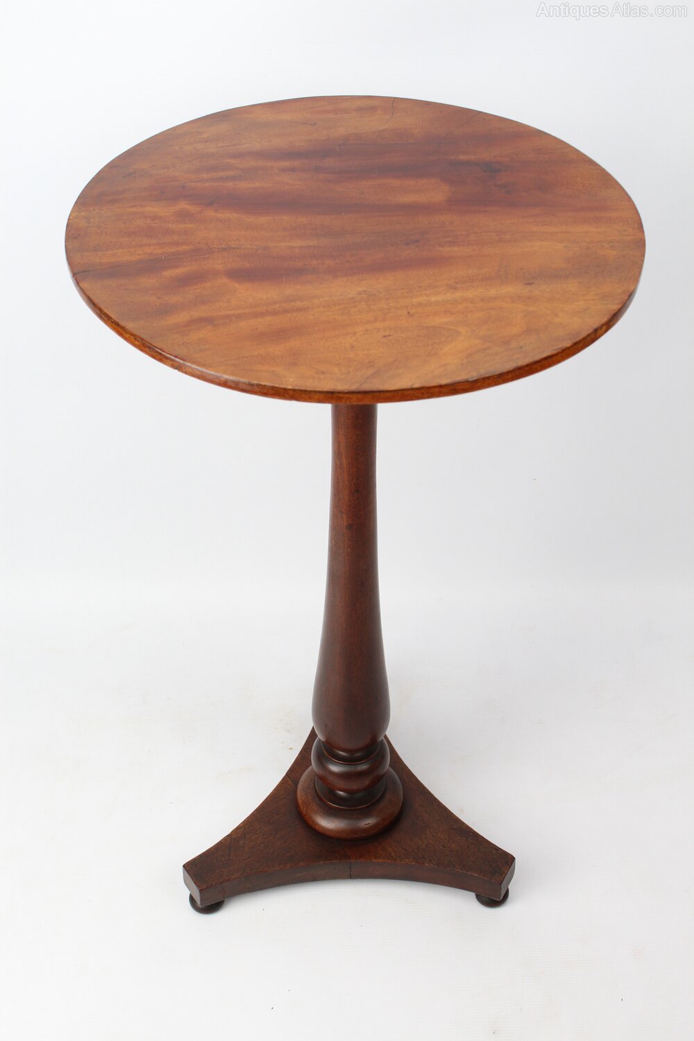 A charming small antique William IV mahogany wine table or lamp table dating from circa 1835. Featuring a well-figured circular top over a tapered column with turned collar, raised on a quatroform base on small bun feet. In good condition with good colour and patina, this wonderful elegant table would make a great lamp table in a living room or hall.