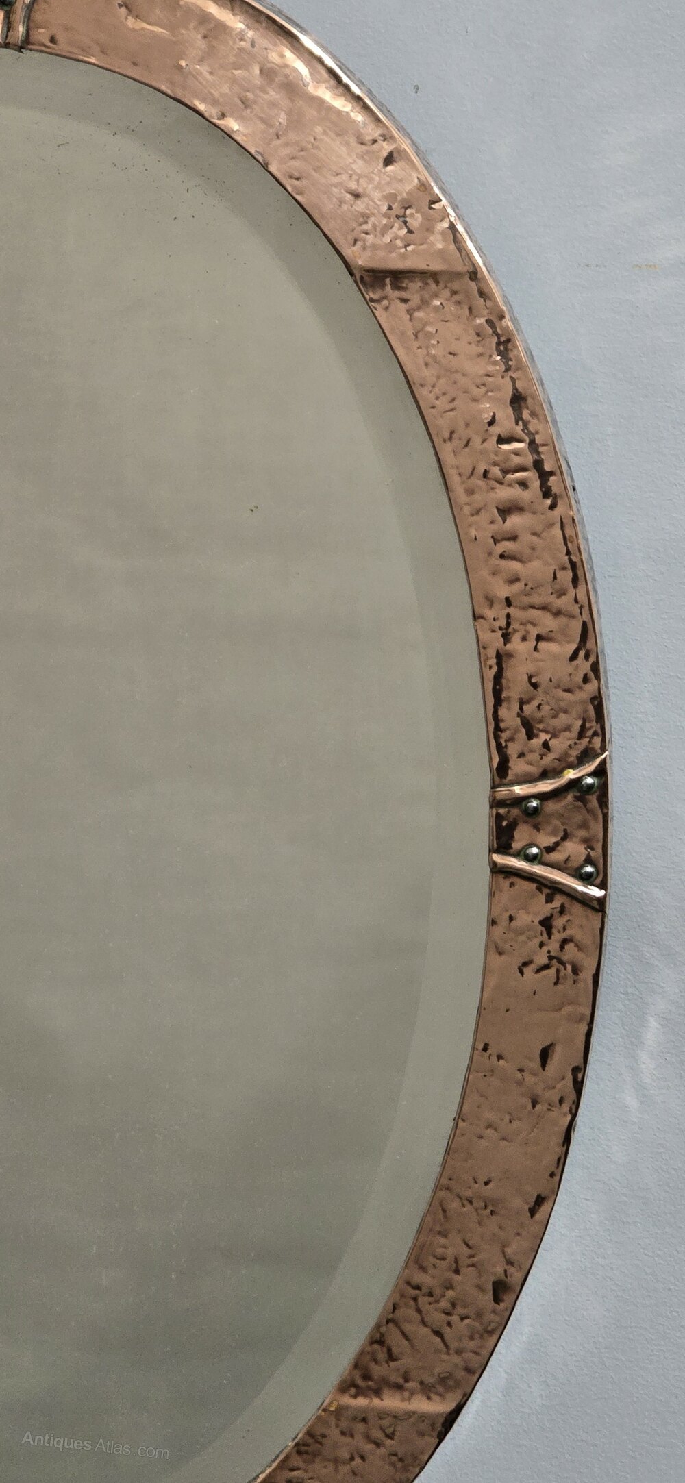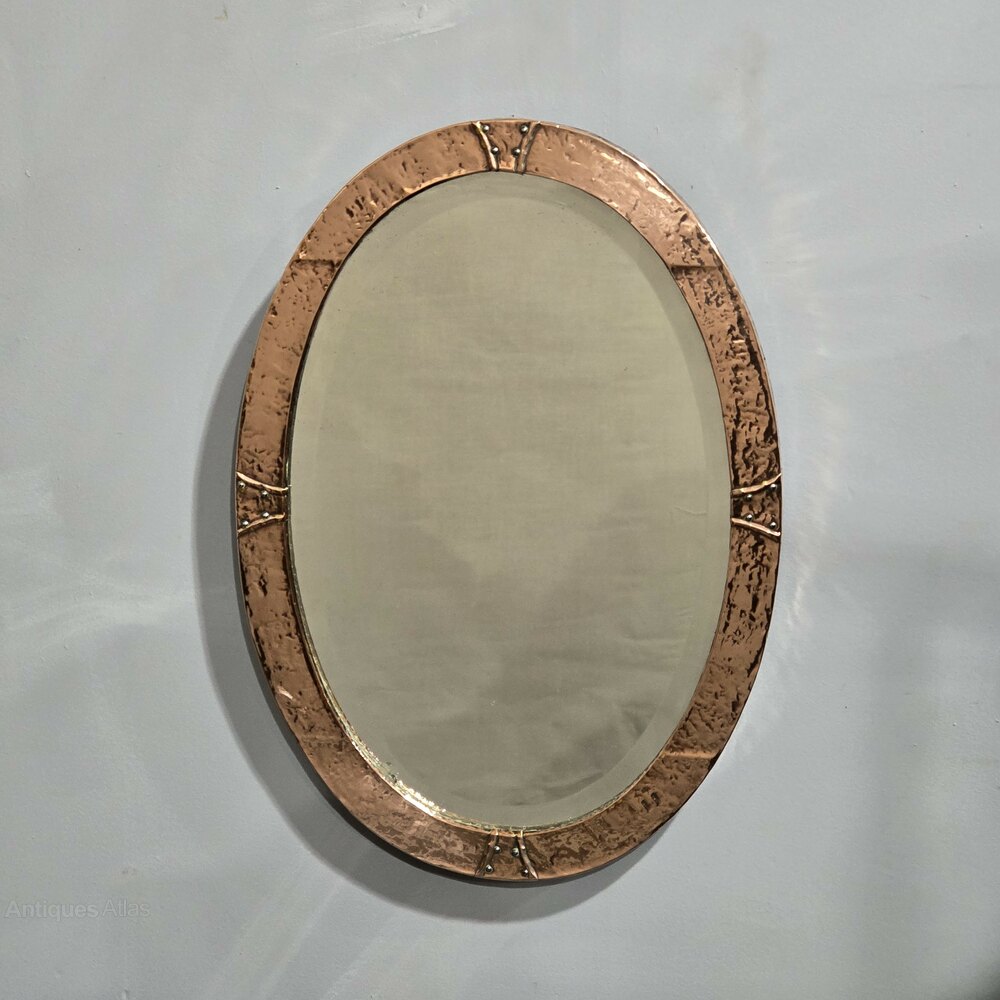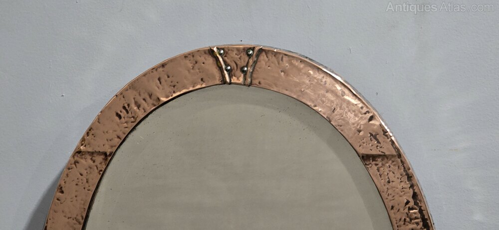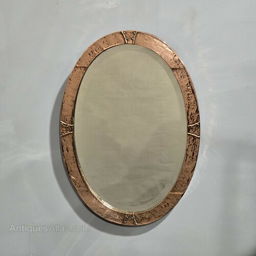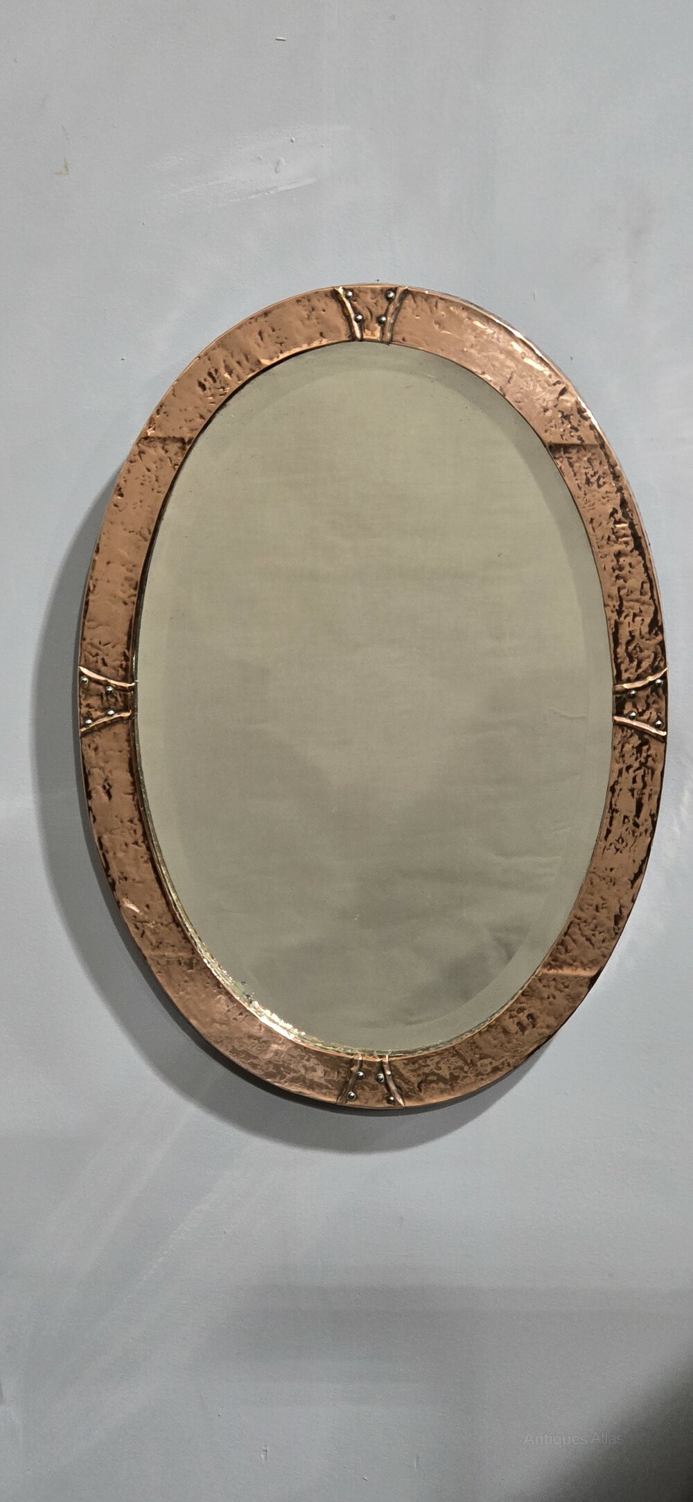 A very nice oval Arts and Crafts bevelled mirror, hand beaten copper frame with four decotrative pieces, slight fxing to the plate, in overal very good original condition.