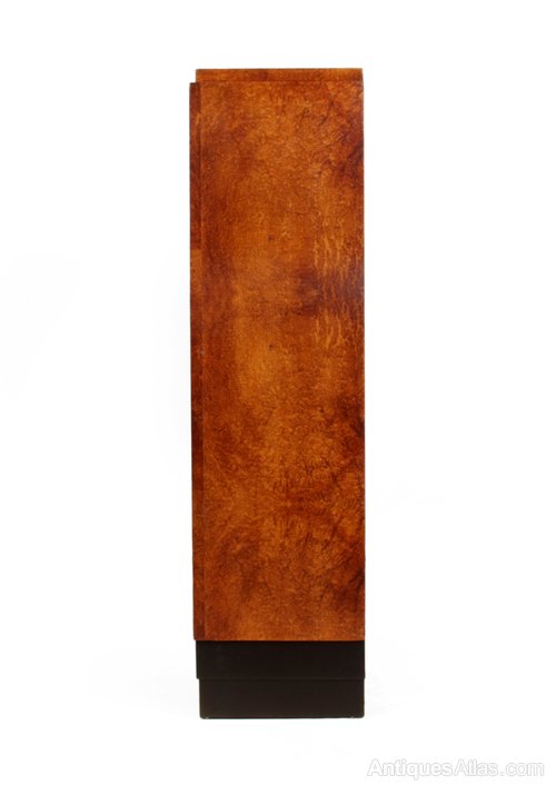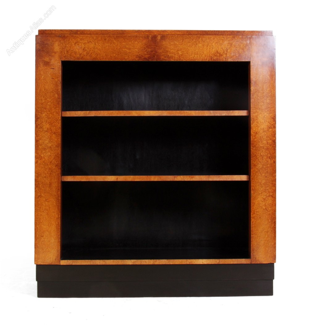 This Art Deco Amboyna open bookcase was produced in France in the 1920's it has two adjustable shelves, ebonised interior and plinth. This bookcase has been fully restored and polished and is in excellent condition