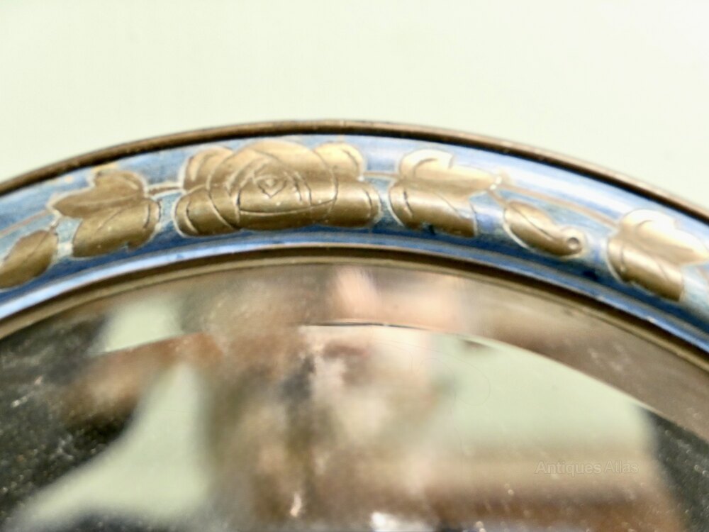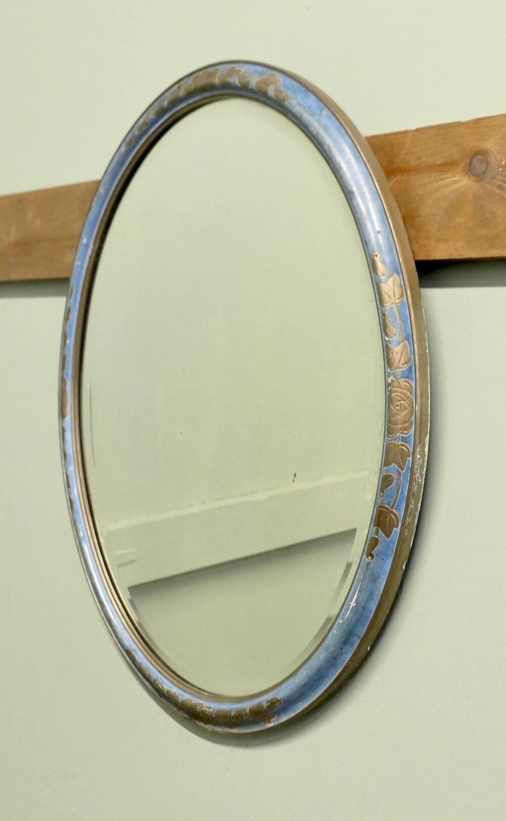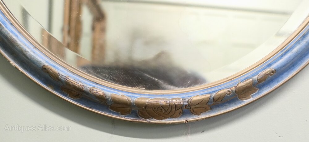 This Mirror has a blue moulded oval frame with an embossed gilt floral decoration