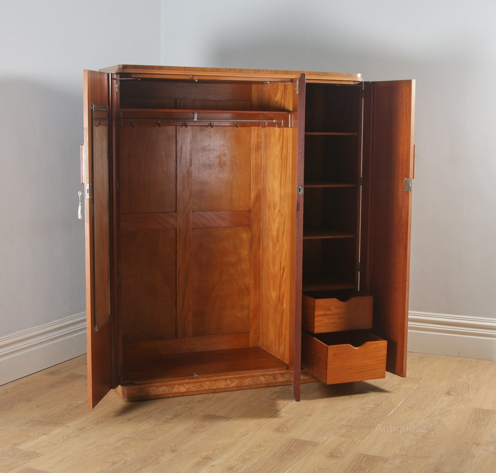 Here is a stunning quality antique English Art Deco bur maple, satinwood and walnut three-door wardrobe, circa 1930, in fine original condition. The three-door wardrobe boasts lovely mirror matched burr maple veneers, original wooden handles and brass key escutcheons. The doors open to reveal the original mirror on the left-most door. The left hand side of the wardrobe interior comprises a storage compartment at the top, with a generous hanging space below, furnished with a hanging rail and 9 hooks. On the right hand side of the wardrobe comprises a fitted interior with a combination of shelves and drawers consisting of four open compartments at the top, with two drawers below. The drawers are mahogany lined and constructed with fine hand dovetail joints. Both doors retain the original working locks (with key), door latches and the original wooden handles. The doors even feature lockable closure hinges, to allow you to adjust the maximum opening of the doors. The wardrobe sits on a recessed satinwood cross-banded plinth. The wardrobe separates into two main sections the plinth and cornice is also detachable, allowing for easy access into a house and up a staircase.