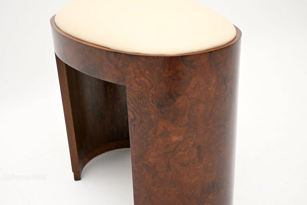 It is a useful and beautiful item, the burr walnut frame is nicely curved, with gorgeous grain patterns and is nicely finished on all sides. The drop in seat is upholstered in gorgeous cream leather. It is perfect for use at a dressing table or as an occasional seat around the home.
