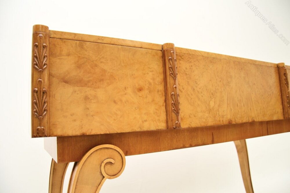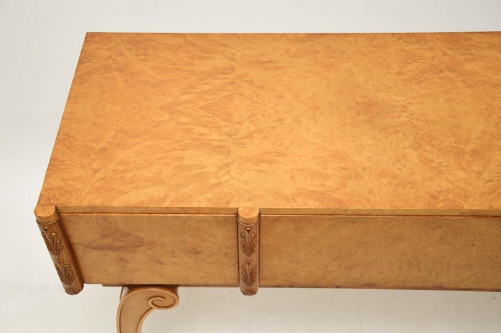 An exceptional Art Deco burr walnut console table by Hille. This was made in England, it dates from the 1920’s.