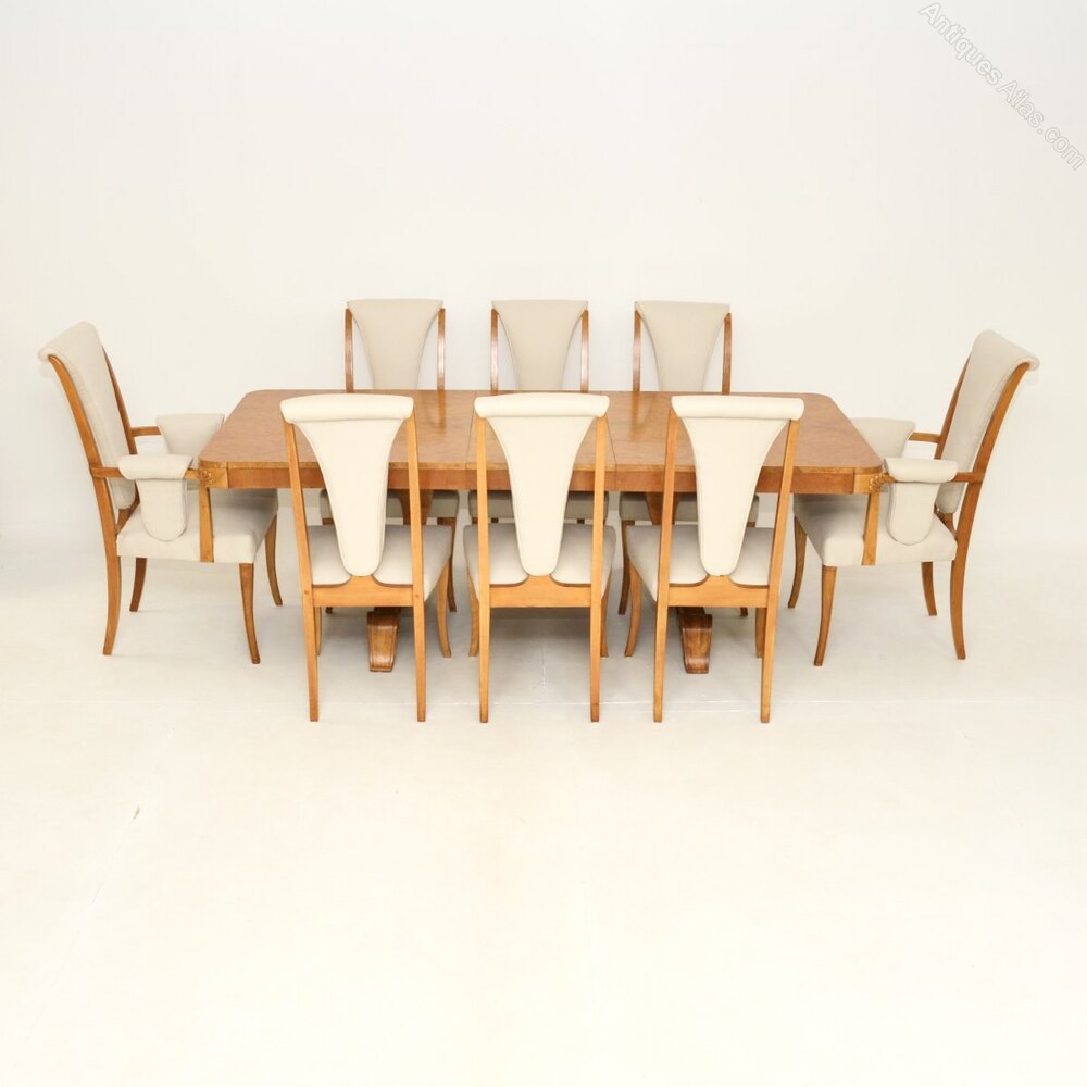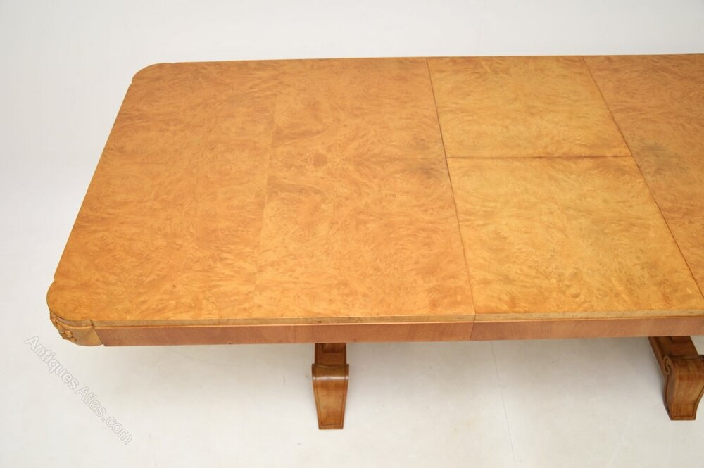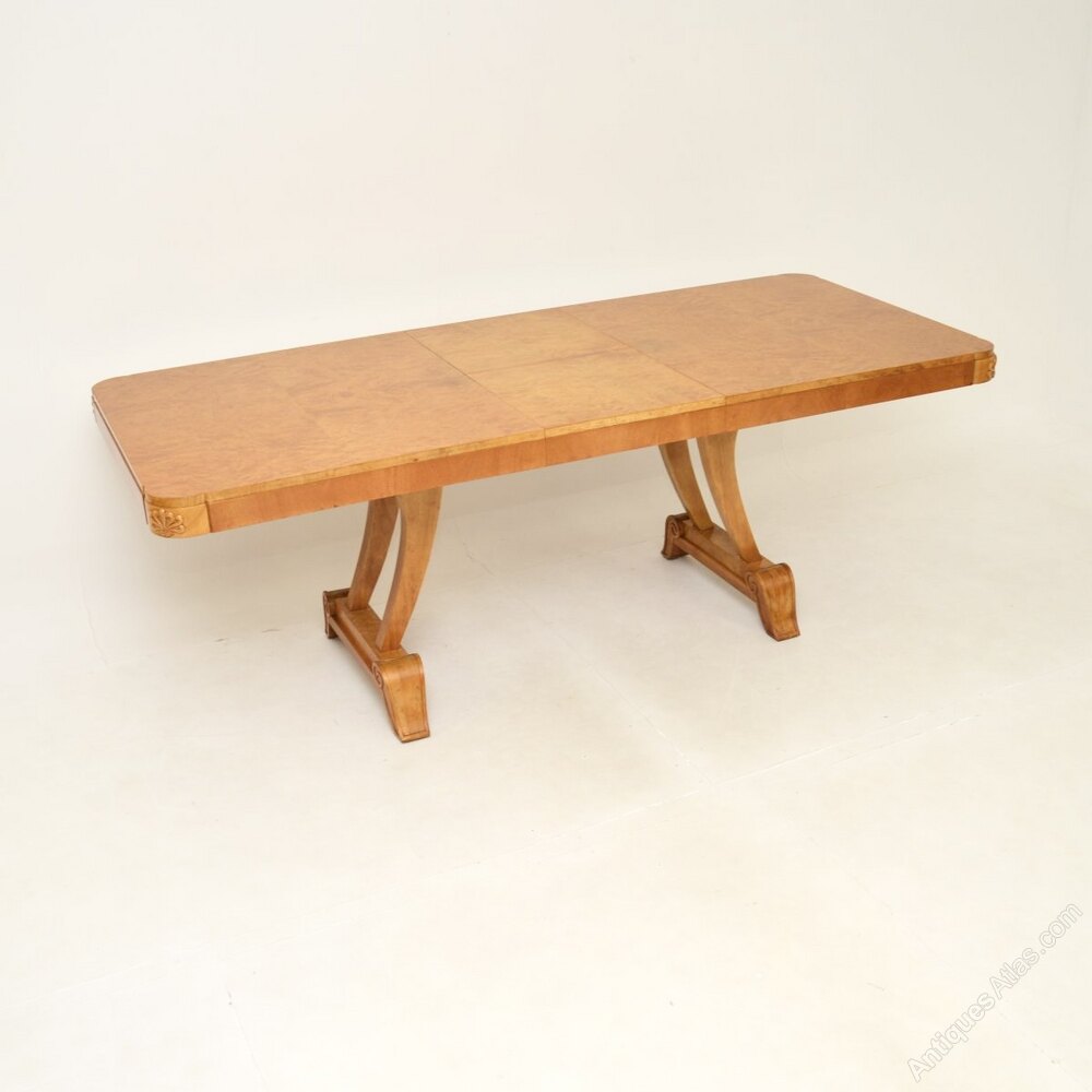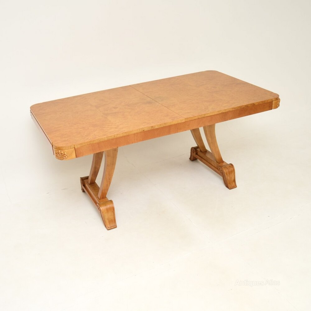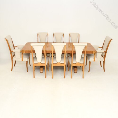 A magnificent Art Deco burr walnut dining table and chairs by Hille. This suite was made in England, it dates from around the 1920’s.