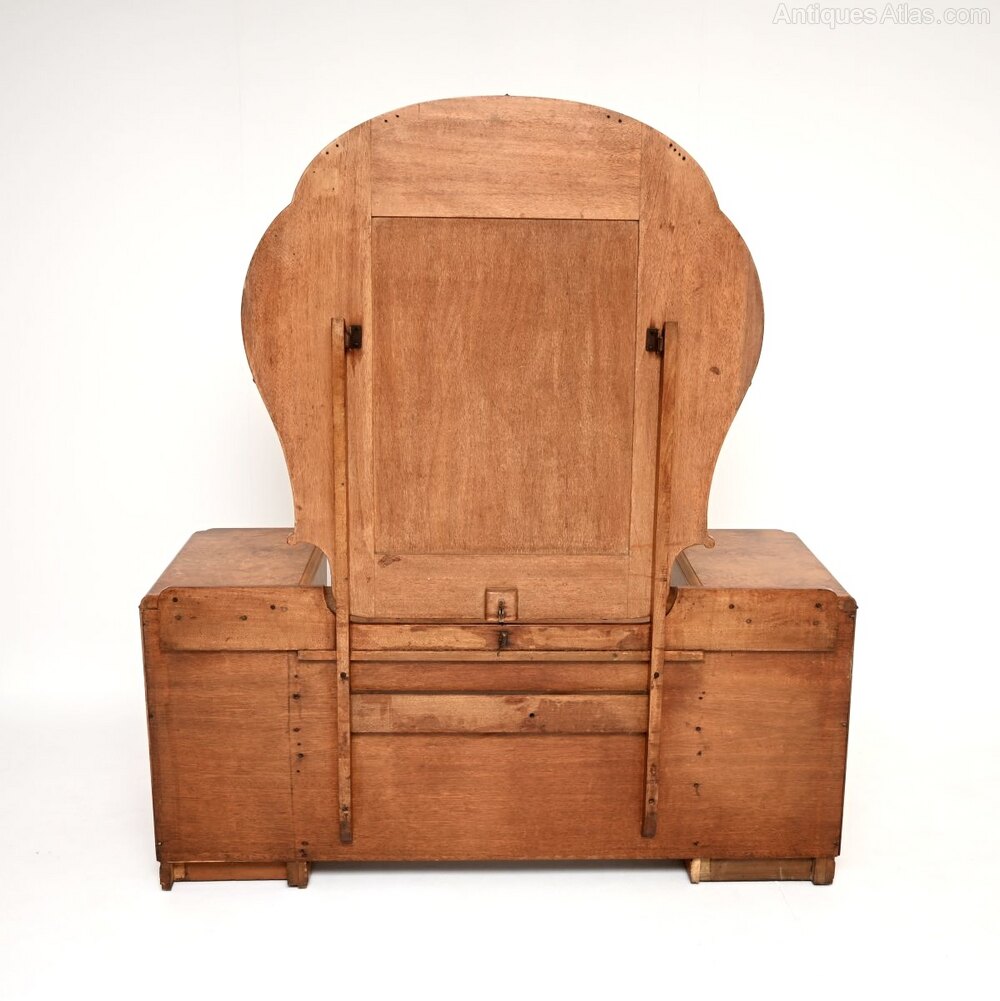 It is large and impressive, the quality is outstanding. This is one of the finest Art Deco dressing tables we have ever come across. The burr walnut grain patterns and colour tones are gorgeous, this stands on a twin pedestal base with lots of storage space, and has a large cloud shaped mirror.