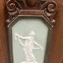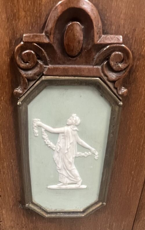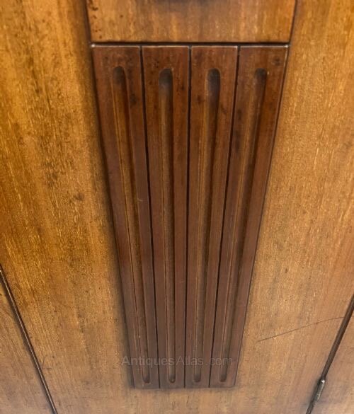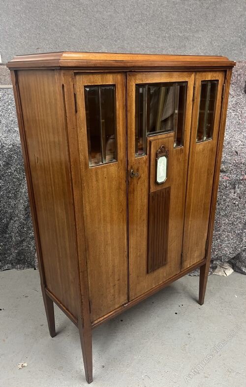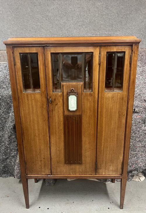 An unusual Continental Art Deco mahogany 3 door cabinet. The polished top having an ogee moulded edge above the combination of 3 doors all retaining bevel edged plate glass windows, the larger centre door with a Wedgwood style porcelain mount of a dancing lady within a carved mahogany frame and a fluted contrasting darker mahogany panel below. The doors open to a shelved interior and the whole stands on square tapering legs with working lock & key. Ideal bookcase or drinks cabinet. Dimensions:- Height…49’’/ 124.5cm. Width…31.25’’/ 79cm. Depth…14.5’’/37cm. Interior Shelf Depth…12.25’’/ 31cm. Delivery to most of U.K. £55.