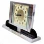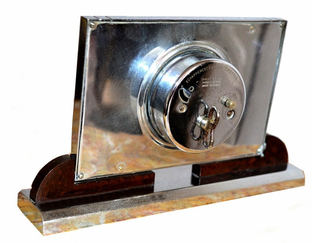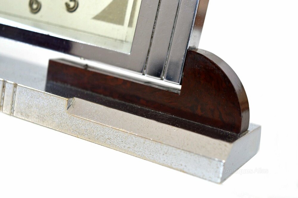 Superb quality chrome frame, highlighted with brown bakelite supports, and a clear reflective silvered dial with very Art Deco style fingers and a bevelled glass face. Fabulously stylish 8-day Deco clock for any authentic Art Deco interior.