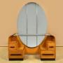 Stylish English Art Deco oak dressing table by Gomme of Wycombe (later famous for their G-Plan brand) c.1930. Distinctive machine-age design featuring 35" x 53½" oval dressing mirror in three pieces with a chrome trim, bisected by the plate glass table top (height 26"). Oak veneered base with stepped drawer pedestals flanking the kneehole. Oak veneers with dramatic ebonised black trim, drawer handles and plinth. Gomme badge inside the top right hand drawer. Excellent condition, fitted with new mirrors, cleaned and waxed in our workshops.