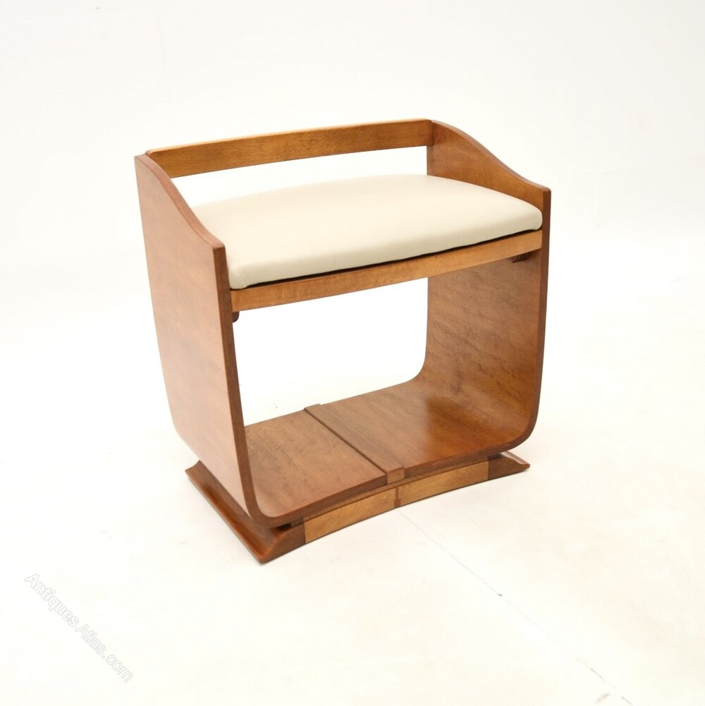 It is a useful and beautiful item, the U shaped frame has gorgeous grain patterns and is nicely finished on all sides. The drop in seat is upholstered in gorgeous cream leather. It is perfect for use at a dressing table or as an occasional seat around the home.