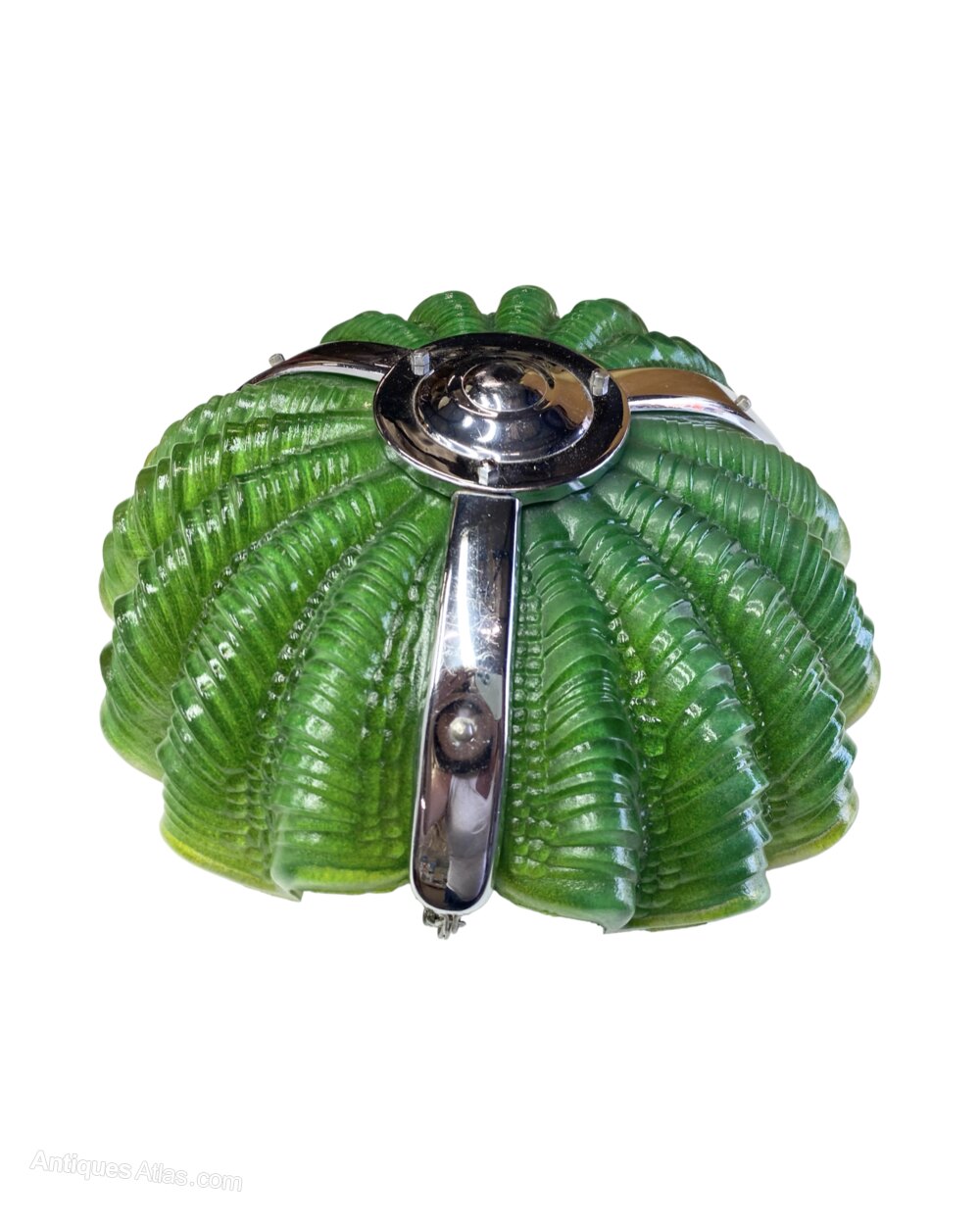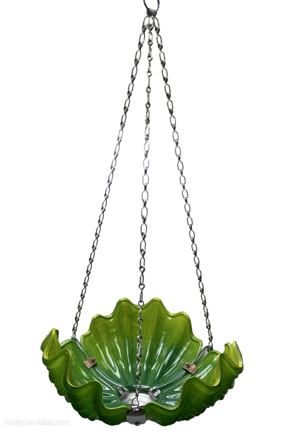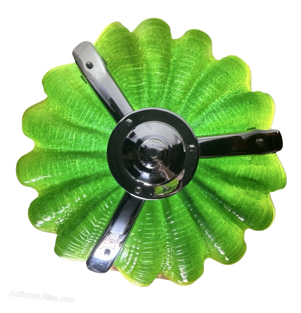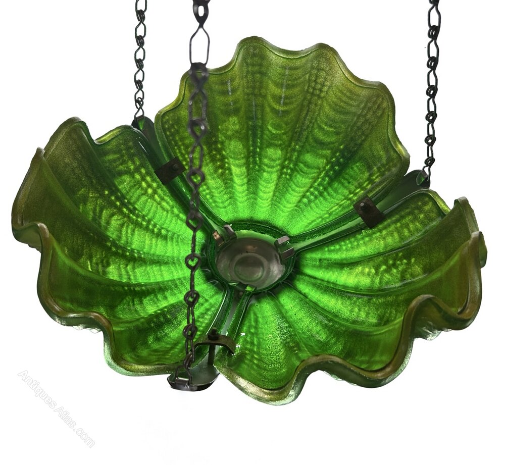 A striking Emerald green Art Deco Shell Ceiling Light. The 3 shells in excellent condition are a beautiful graduated emerald green and literally glow when the light is shone on them. The chrome frame is in lovely original condition snd the shells fit neatly into the frame and are held in place via small chrome brackets. This shade comes with chain and chrome ceiling hook and antique style gold spiral silk flex with brass bayonet.