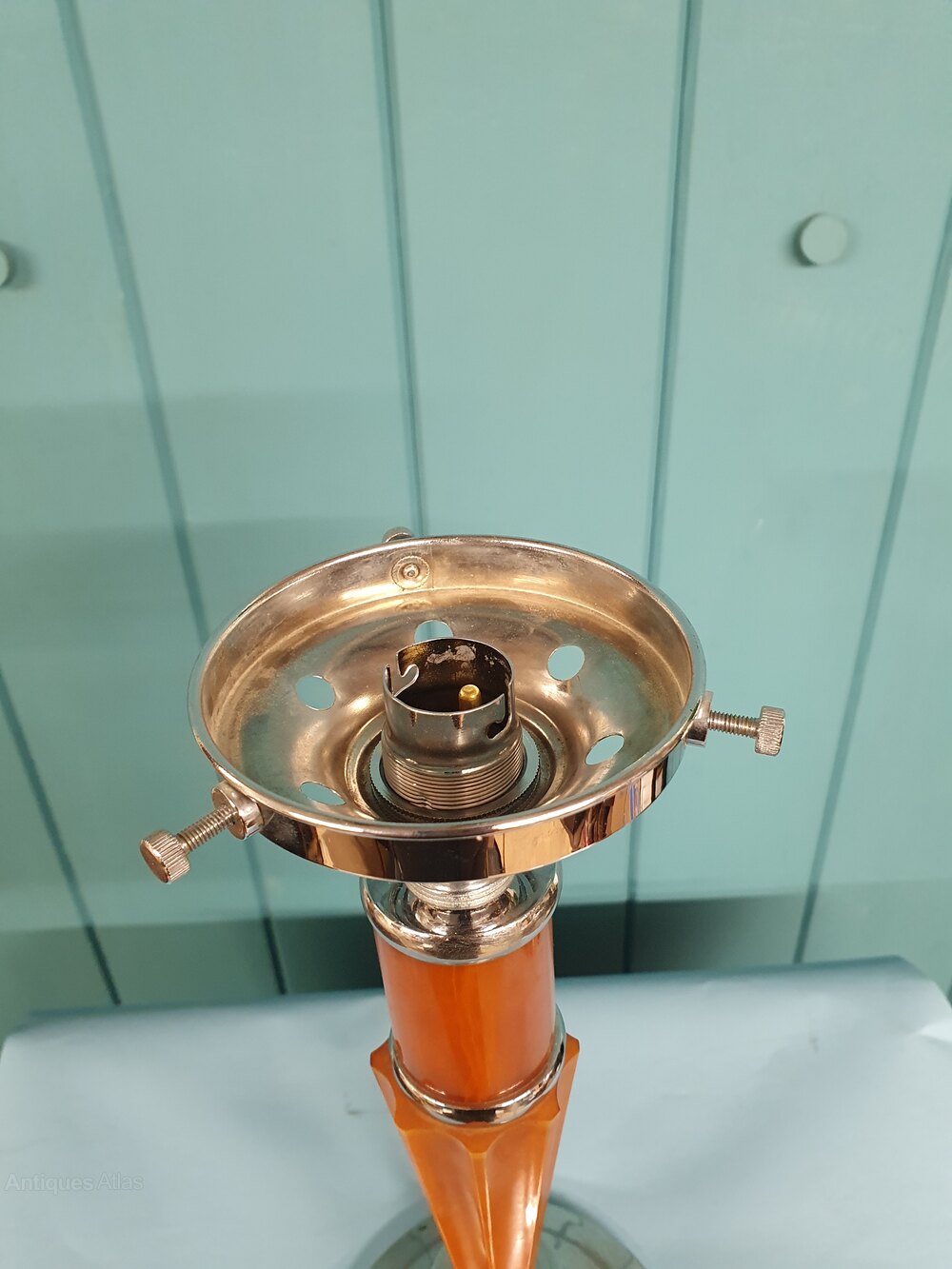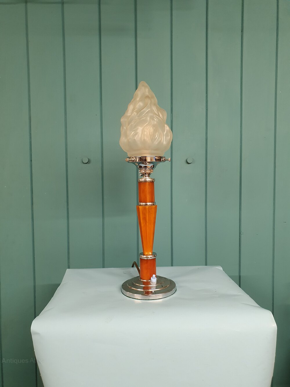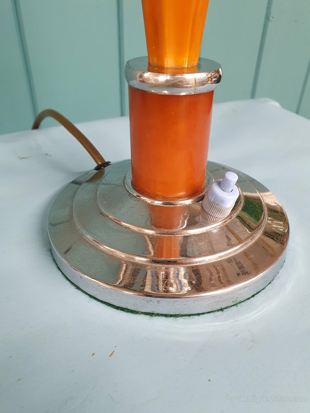 This art deco lamp is in chrome and Bakelite with a faux marble effect. This piece has a switch in the base, has been rewired. The shade is 13 cm wide and 19 cm high. The height of this lamp without the shade is 31 cm. This piece comes with 2 m of cable, a large bayonet bulb holder B22, and has been PAT tested.
