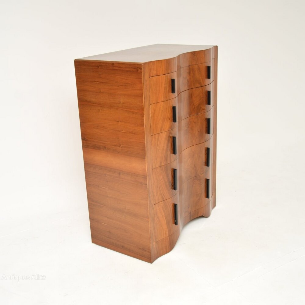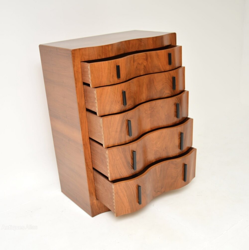 It is a great size and is of lovely quality, with an unusual and stylish serpentine shape to the front. There is lots of storage inside the generous drawers, which have finely crafted solid wood handles.There are stunning figured walnut grain patterns and colour tones throughout.
