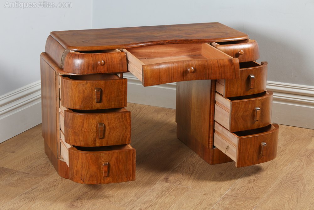 Here is an example of a good quality and unusual antique art deco figured walnut serpentine desk, circa 1930, in excellent original condition. The desk boasts a classic “skyscraper” design, with a stepped serpentine shaped top section above two bow shaped pedestals. The top of the desk features stunning quality figured walnut, mirror-matched veneers. The top section consists of three serpentine shaped drawers above a bank of three bowed drawers in each pedestal. The desk retains its original walnut knobs and handles. The pedestals sit on elegant recessed art deco curved plinths. This desk boasts classic art deco styling in the overall design of the curved corners, clean lines to the tops, the handles and the feet. The drawers feature sycamore linings. This is a single piece desk. It is unusual to see of a desk of this design and shape in the marketplace.
