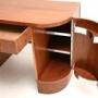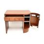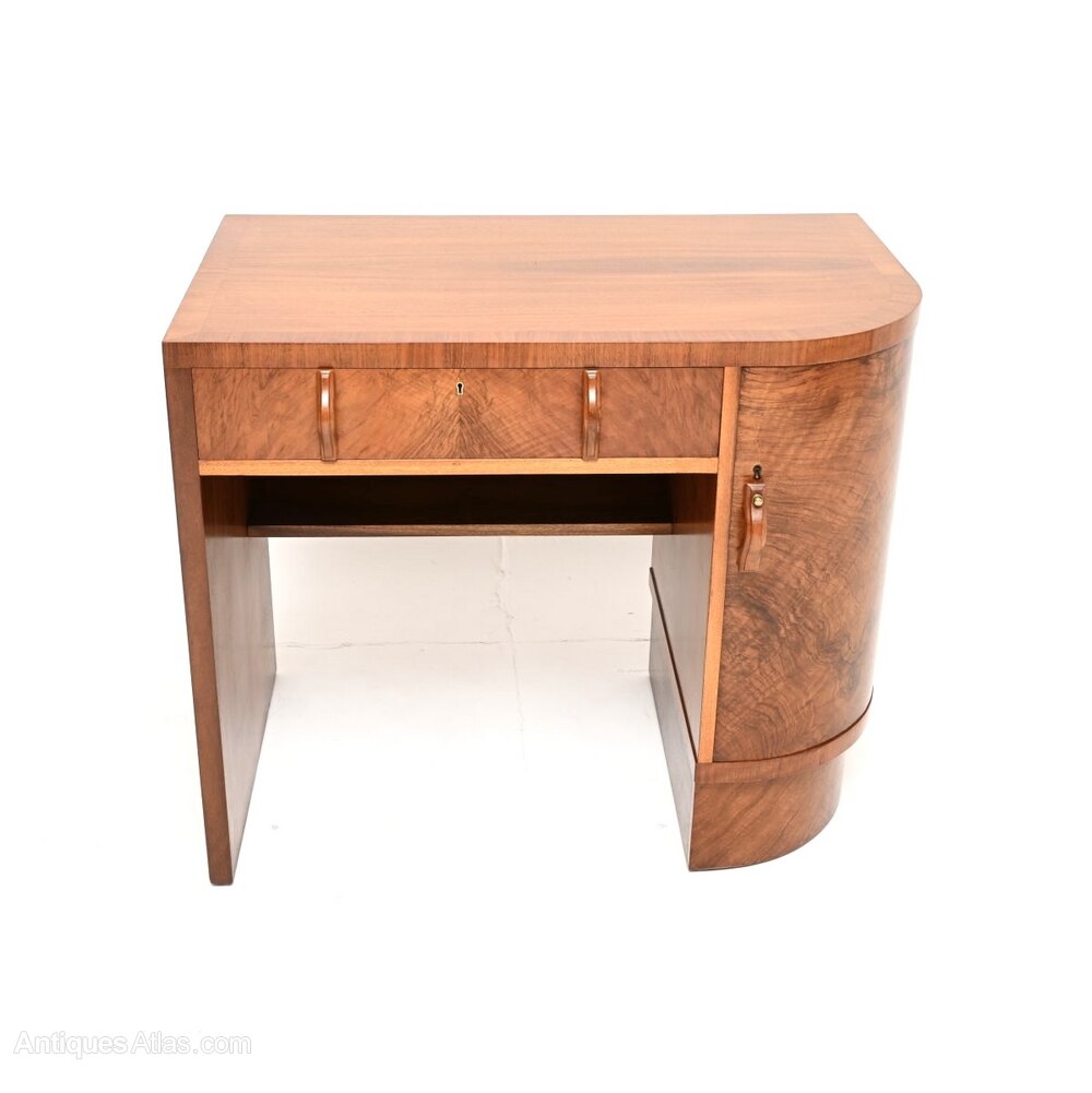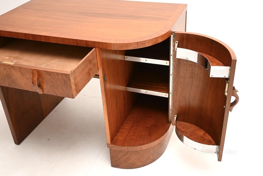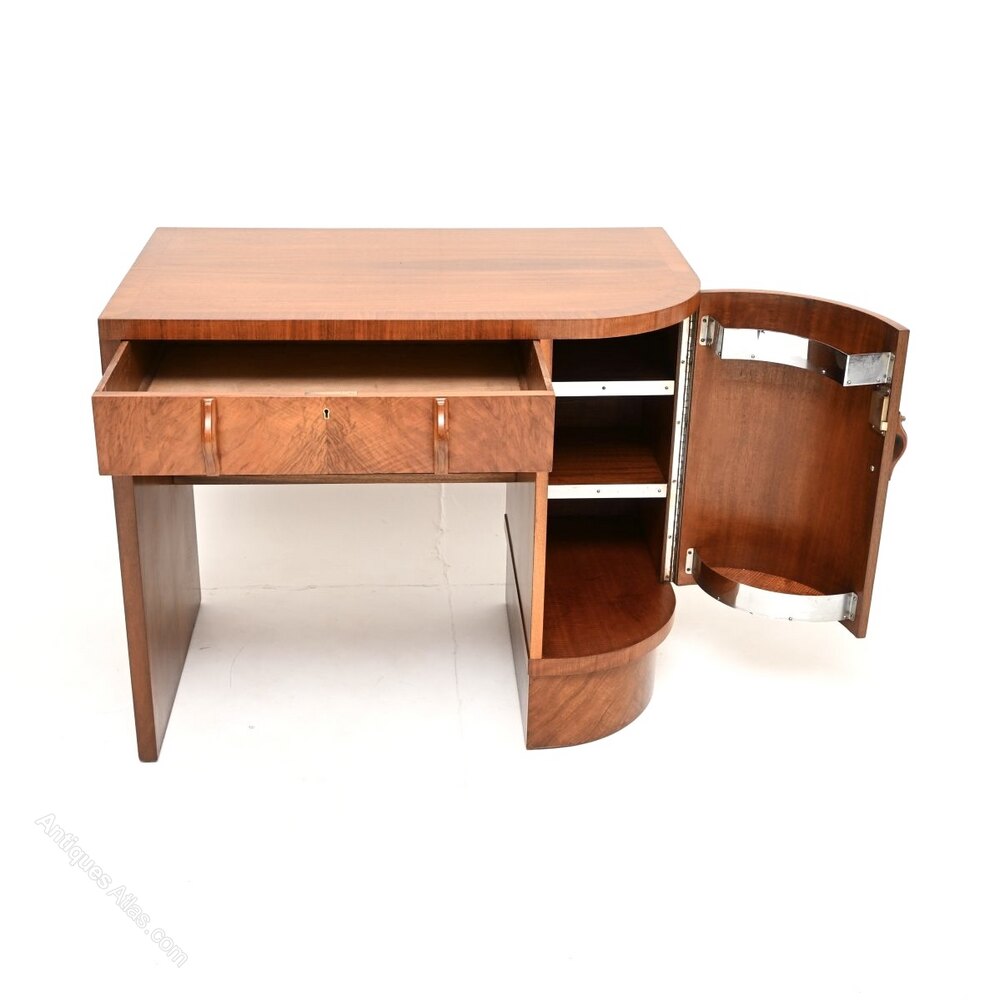 It is an unusual design, with a nice and compact size, the quality is absolutely amazing. One side is curved with a useful cabinet space, there is also a single drawer in the middle. The solid wood construction has beautiful figured walnut veneers, giving a striking effect. The carved walnut handles are original, and this is also beautifully polished on the back, so can be used as a free standing item.