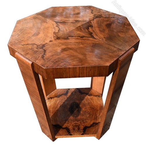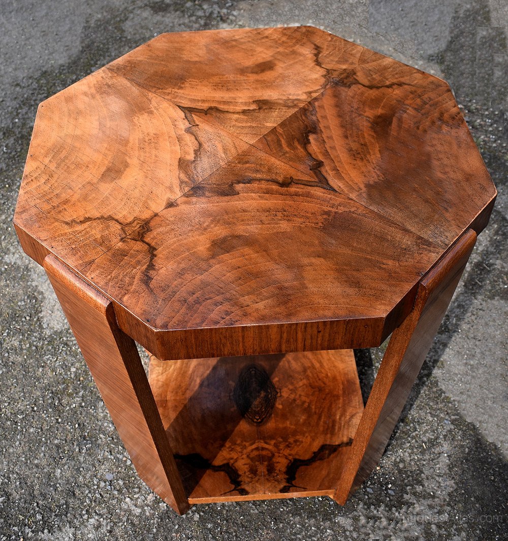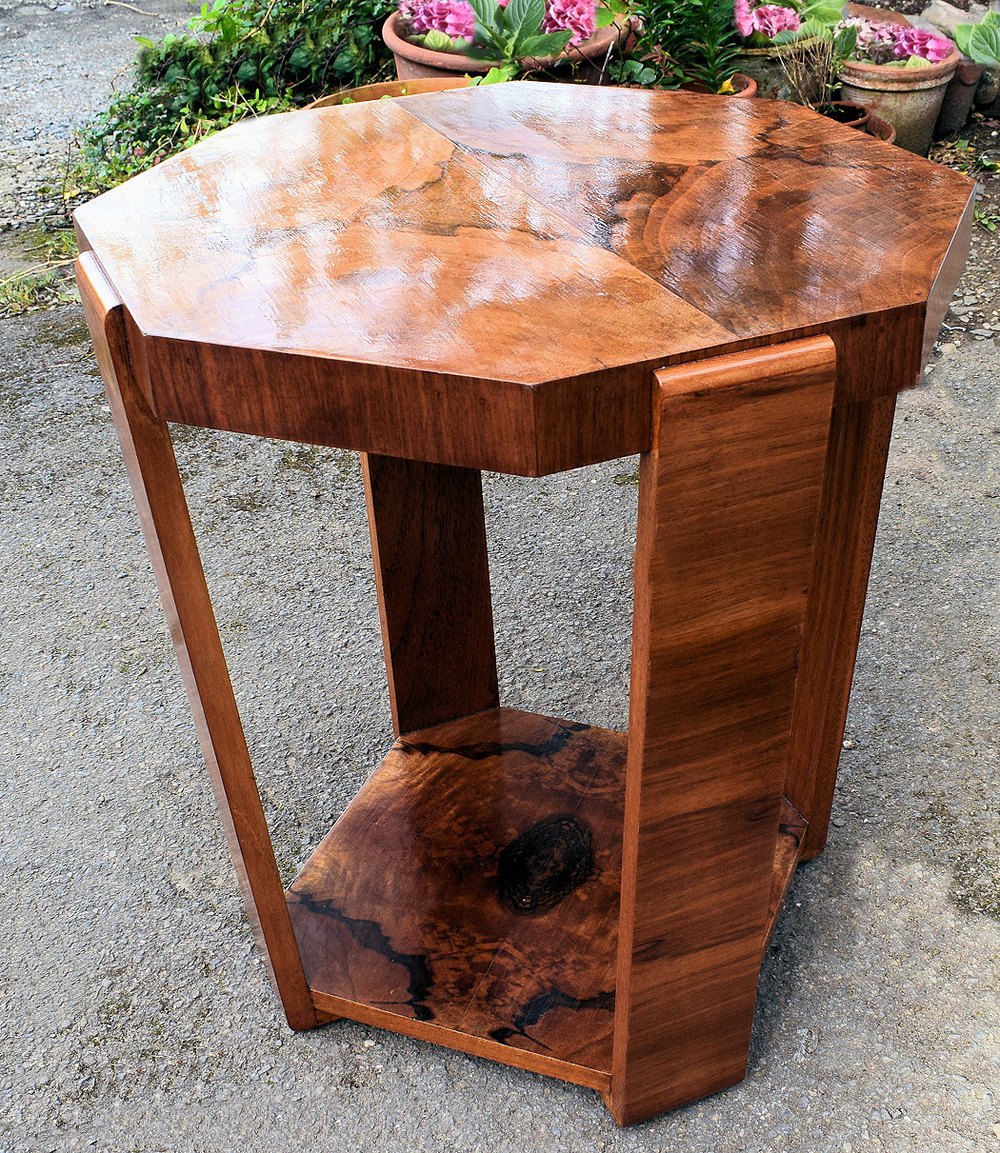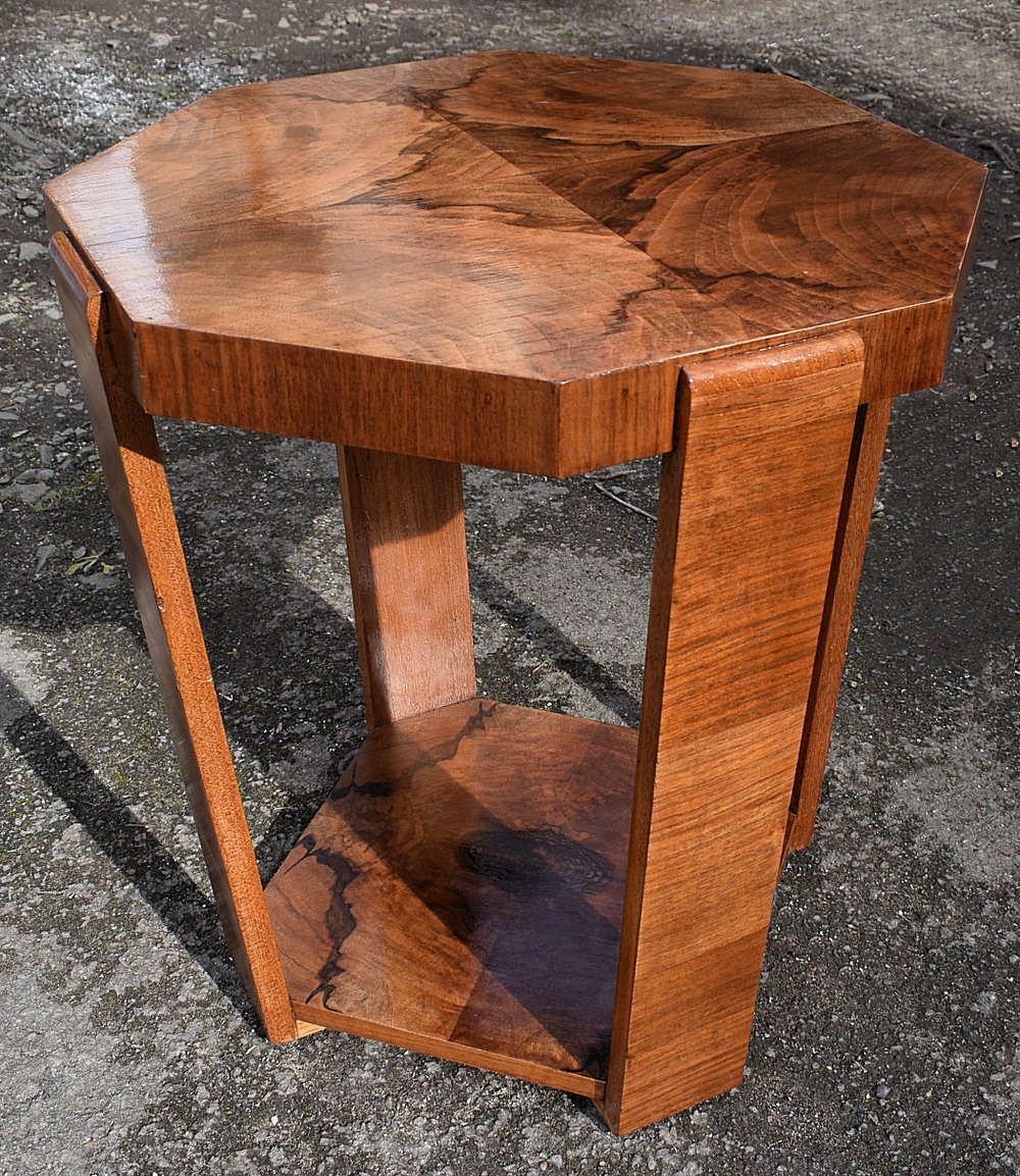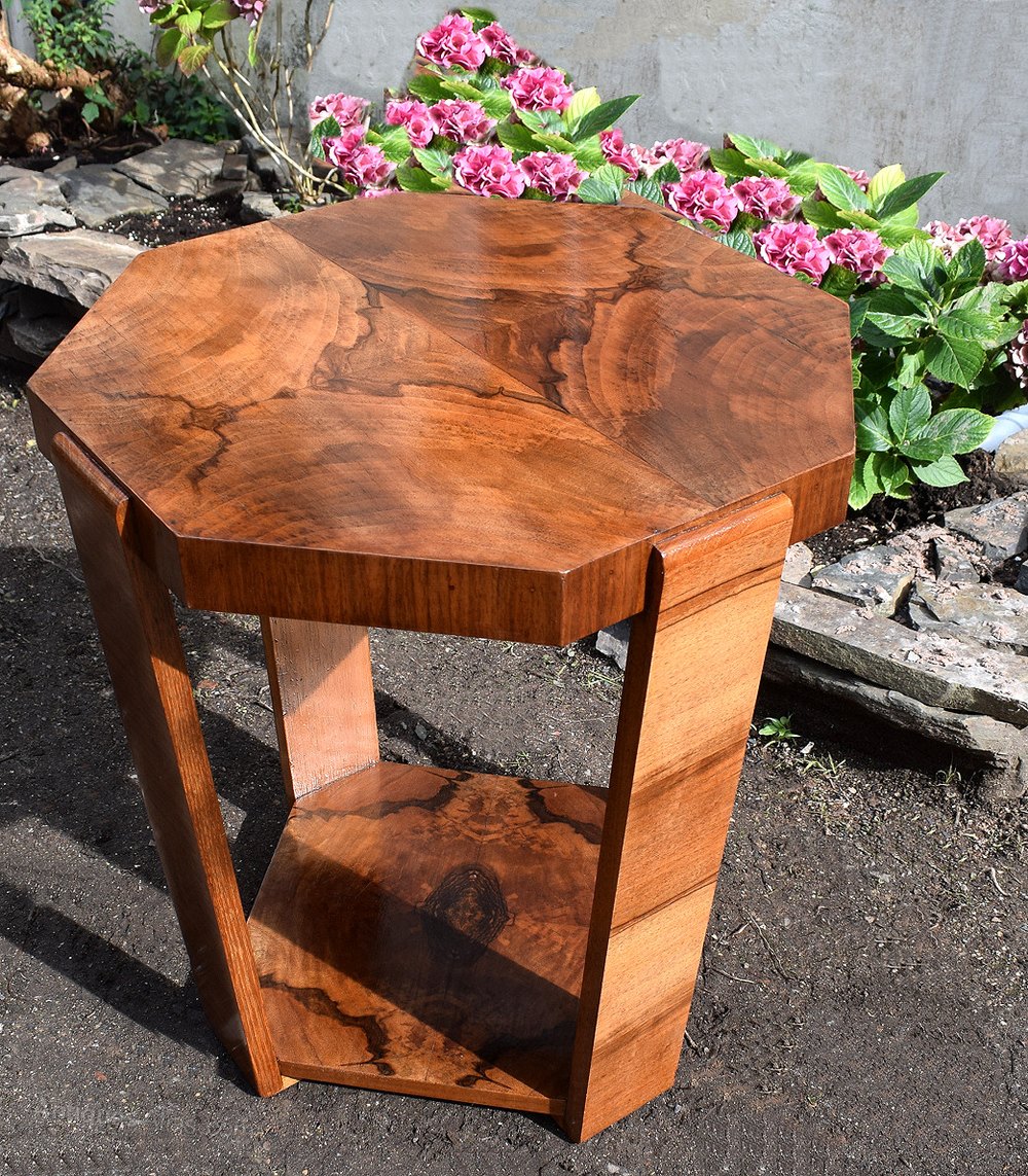 For your consideration is this 1930s English occasional table in beautifully figured veneers. Great design with tapering legs, two tiered so can display on the lower plateform, perhaps a figure? Quartered veneered book page top so cut from the centre of the tree, definitely a table you won't get bored of admiring. Condition is excellent, it's been through our workshops and fully restored.
