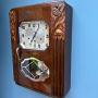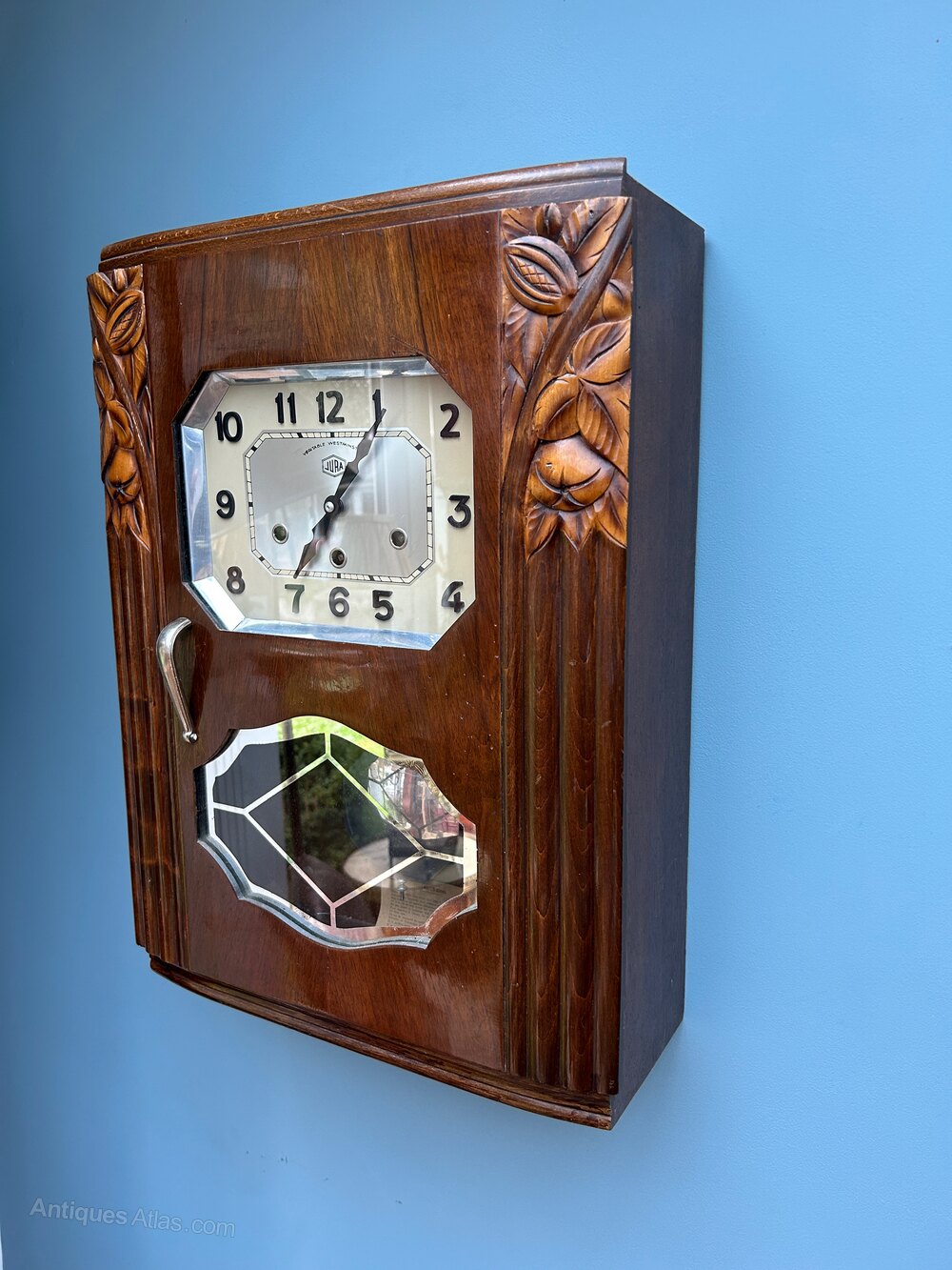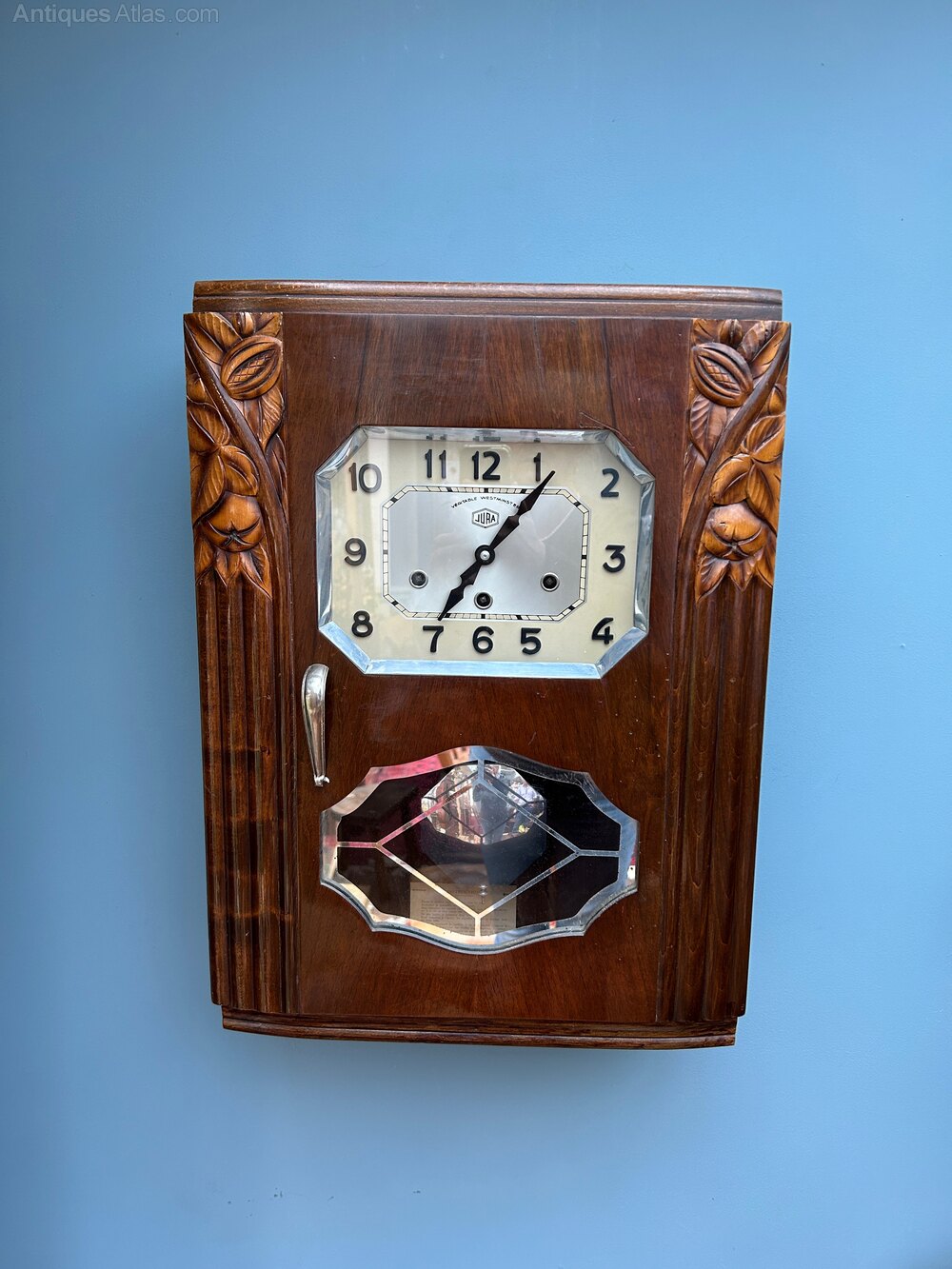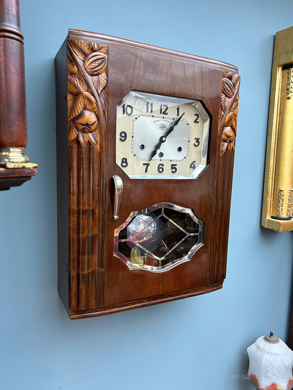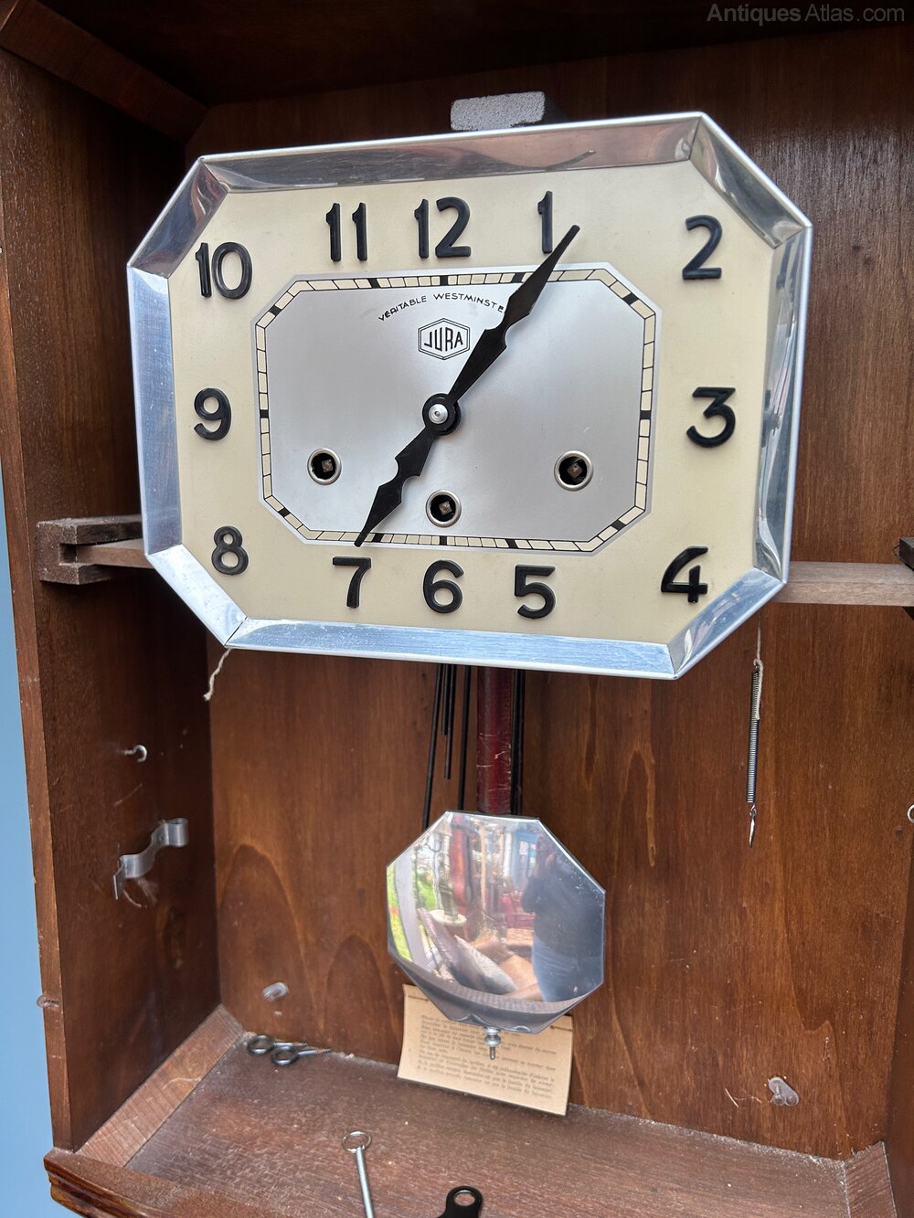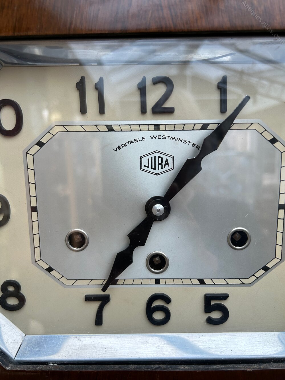 Absolutely lovely French Jura Westminster chime wall clock. Strikes on the quarters, half hour and hour on chime bars. Circa 1930 this clock has a mahogany case with silvered dial and chrome bezel. Comes with pendulum and key. In full working order.