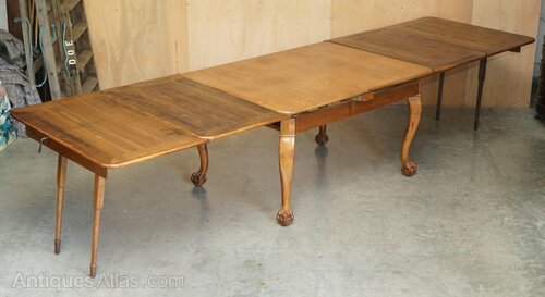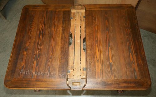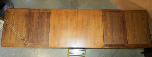 I have never seen another table that extends as much as this, it literally triples in space, the table starts as a standard 140cm wide six person dining table, there are wrought iron levers under each end, you turn and pull them and then the magic happens, as you pull the extensions out, twin support legs with turned ends drop down increasing the width to a whopping 385cm