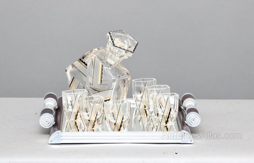 An Art Deco glass liqueur set, the decanter and stopper of faceted pentagon form with gilt banded detail and six hexagonal spirit glasses, all housed on a chrome, ebonised and mirrored twin handle tray.