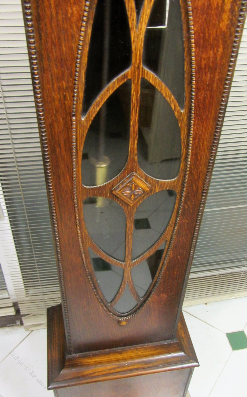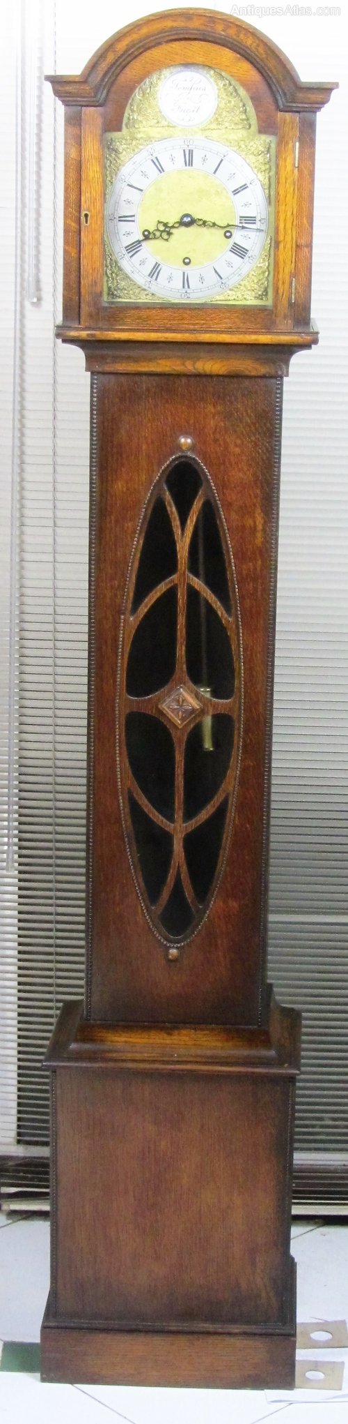 Smart Oak Grandmother or Miniature Longcase/Grandfather Clock with attractive Art Deco Glass Front.