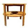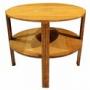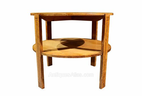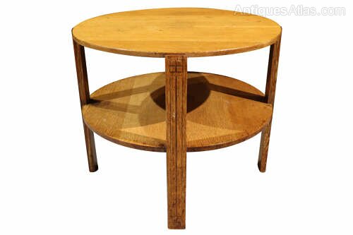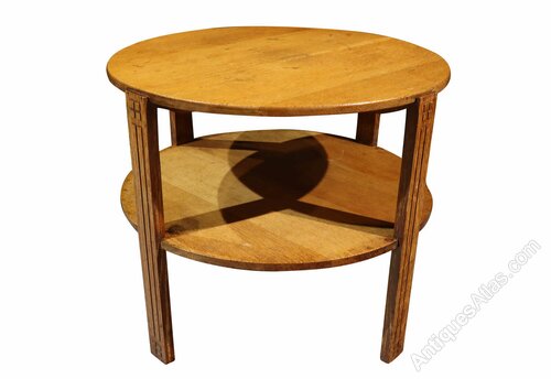 The table features a well-proportioned circular solid oak top, raised on four square-section legs with subtle linear incised detailing, united by a lower circular undertier that provides both visual balance and practical storage. The restrained decoration and emphasis on proportion and craftsmanship are hallmarks of British Art Deco design, where utility and elegance were carefully combined.